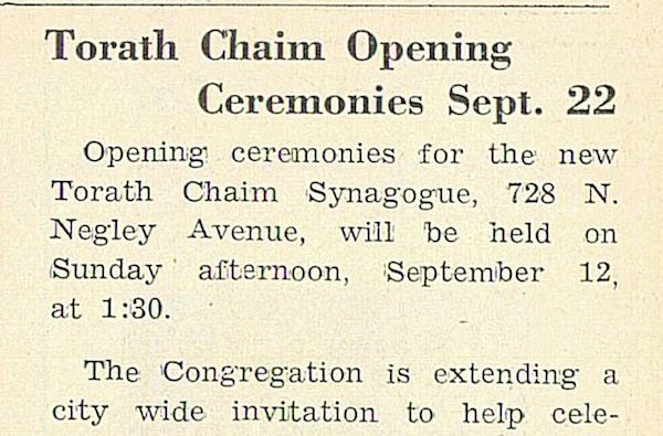 “Torath Chaim Opening Ceremonies Sept. 22.” Unsigned article announcing upcoming ceremonies for the the “new’ Torath Chaim Congregation synagogue, likely referring to extensive renovations made on its building at 728 N. Negley Ave. Speakers include Rabbi Wolf Leiter, Rabbi B. A. Lichter, and Rabbi Joseph Shapiro with music by Cantor David Messeroff and his choir.
