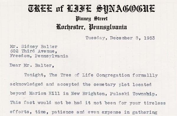 In 1953, Tree of Life Congregation in Rochester, Pa. acquired a 100-foot by 300-foot plot of land above Marion Hill in Pulaski Township to use as its cemetery. A member named Sidney Balter oversaw the negotiations for the purchase.
