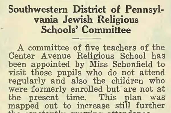 Through the efforts of Miriam Schoenfield, the National Council of Jewish Women-Pittsburgh Section established the Tri-County Institute in Johnstown in 1925. The Institute oversaw religious education in the area, including in Nanty Glo.