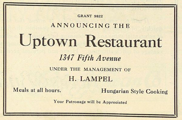 Advertisement announcing the opening of the Uptown Restaurant at 1347 Fifth Ave. under the management of H. Lampel. Notes “Hungarian Style Cooking.”