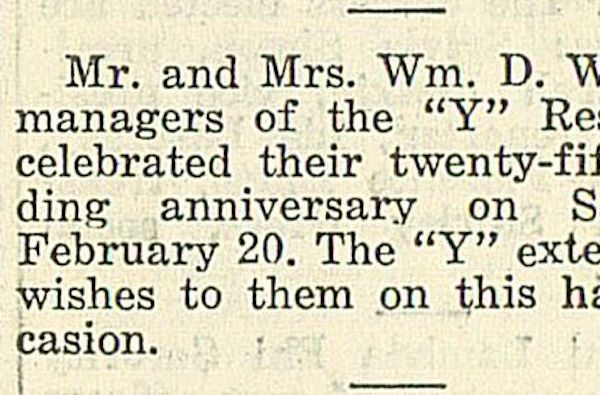 Notice congratulating Y Restaurant managers Mr. and Mrs. Wm. D. Wiedman on their 25th anniversary.