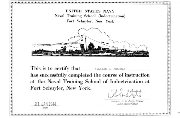 Selection of miltiary certificates issued to William Ira Adelman during his enlistment and training in the U.S. Navy during World War II. Four documents.