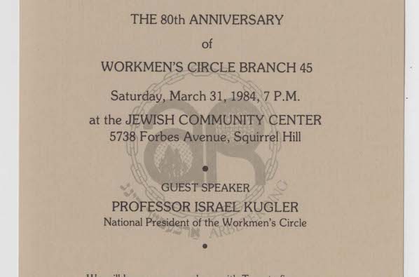 Invitation for Workmen’s Circle Branch 45 80th anniversary dinner at the Jewish Community Center in Squirrel Hill featuring Israel Kugler. 1 page.