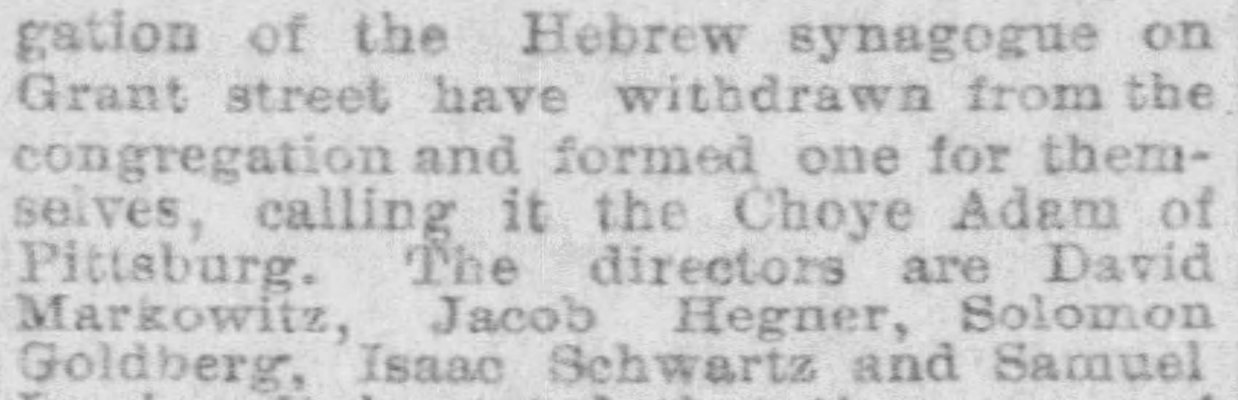 - Choye Adam charter approval, Pittsburgh Dispatch, Sept. 25, 1889 (online—Newspapers.com).