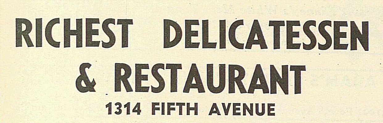 Anna Richest started the Richest Delicatessen Shop around 1914, shortly after the death of her husband Peter. The shop was originally located at 82 Logan Street, in the same building as Reichbaum’s, and was listed in city directories as a confectionary. Richest Sanitary Delicatessen relocated down the block to 1314 Fifth Avenue in 1922.[1]“Richest Sanitary Delicatessen Ship Removes to 1314 Fifth Avenue,” Jewish Criterion, May 5, 1922 (online). Anna Richest married Leon Mitchel in 1924, and they ran the business together for many years.