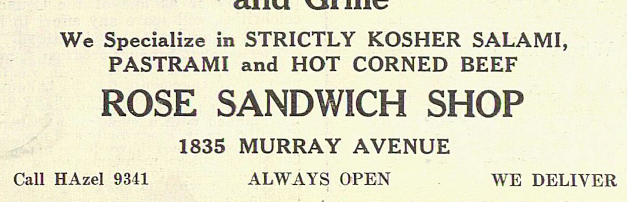 Rose Sandwich Shop opened in October 1930 and appears to have been one of the original tenants of the Born Building at the northeast corner of Murray Avenue and Bartlett Street. The restaurant initially specialized in “strictly kosher salami, pastrami, and corned beef.” By 1935, and perhaps earlier, it was operated by a former cab driver named Julius Solvitz. If earlier, it may have been named for his older sister, Rose.