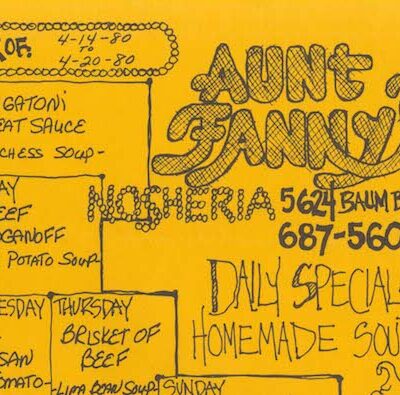 Aunt Fanny’s Nosheria was located in East Liberty from 1977 into the early 1980s. A partnership called Deli Associates purchased a former Gulf Oil Corp. gas station at 5624 Baum Blvd. in early 1977 for $165,000 and hired architect Donald Solow and Triangle Construction to renovate the property into a restaurant. Investors included Beth Adams, Larry Adams, Harvey Goss, Donald Hirschman, Richard Kann, and Stephen Katz. Iz Cohen was restaurant manager. Originally billed as a “drive-in” delicatessen, the restaurant had cafeteria-style service without wait staff. Aunt Fanny’s Nosheria closed in the early 1980s. Wingfield’s Place was operating out of the location by 1985.