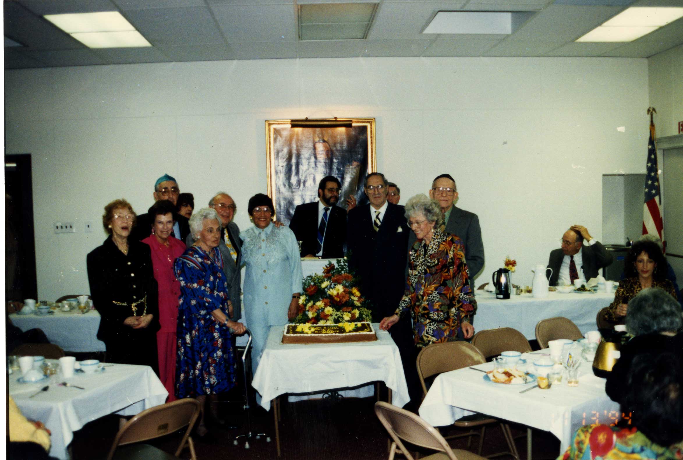 The “original” members of Beth Israel Congregation in Latrobe before they cut the cake at a 40th anniversary celebration. Although the congregation was founded in the early 1900s, the celebration marked the anniversary of the construction of the synagogue on Weldon Street. From left to right: Tiby Goldman, Mort Glick, Joan Mendler, Gus Lowenstein, Bob Mendler, Bev Glick, Bill Dunhoff, Gladys Dunhoff and Hymen Weiss.