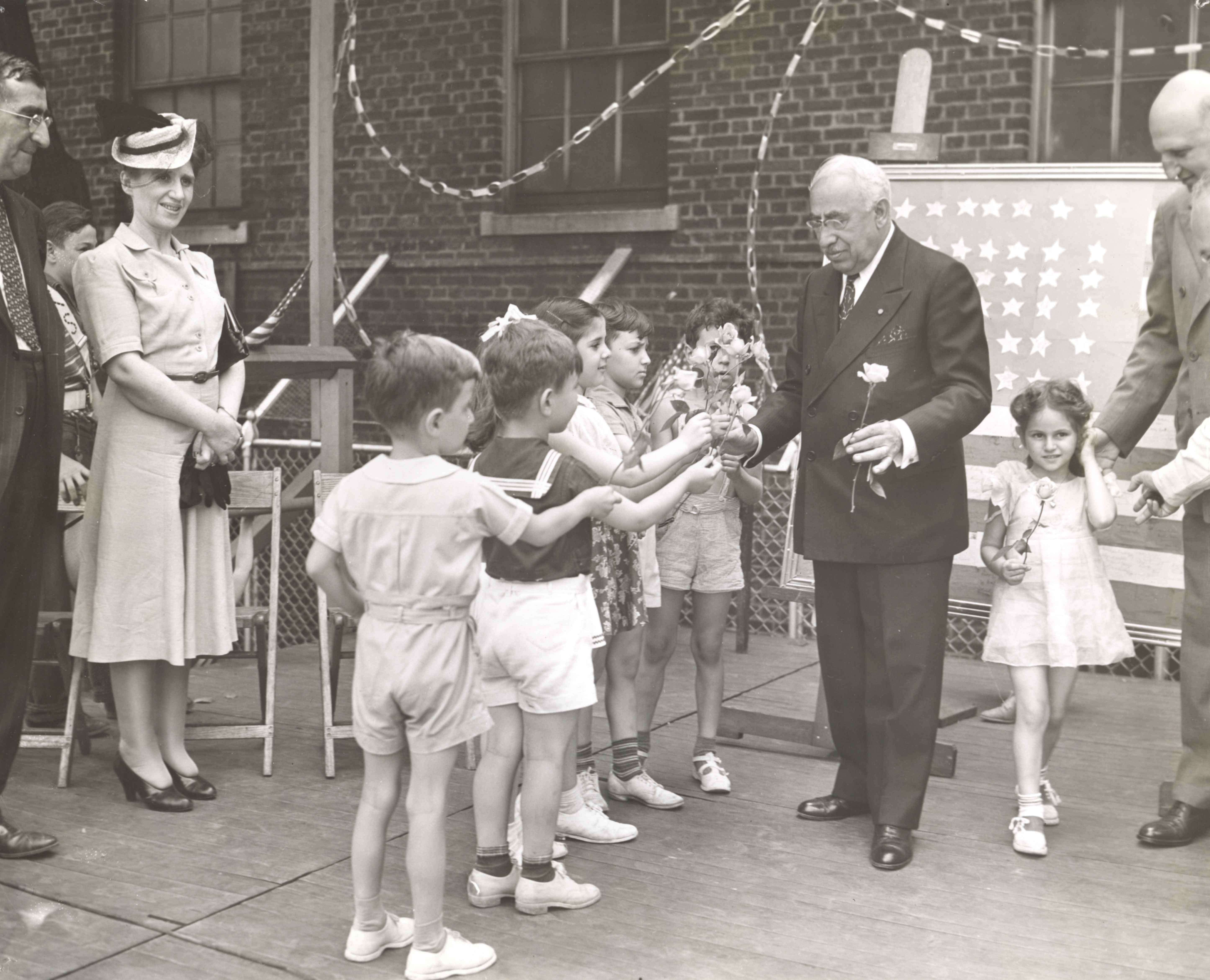 Kaufmann’s Department Store founder “Uncle Henry” Kaufmann giving flowers to children at the Irene Kaufmann Settlement House on the occasion of his 80th birthday.