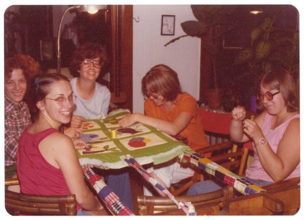 Color photograph of (left) Louise Silk with fellow volunteers from Chicago’s Women’s Liberation Union’s Health Evaluation and Referral Service (HERS) at a quilting retreat.