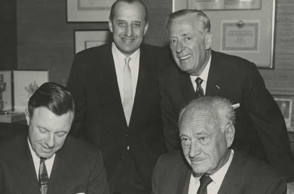 The hotelier Conrad Hilton (seated right) and Nathaniel Kann (standing left) signing papers related to the construction of the Tel Aviv Hilton.