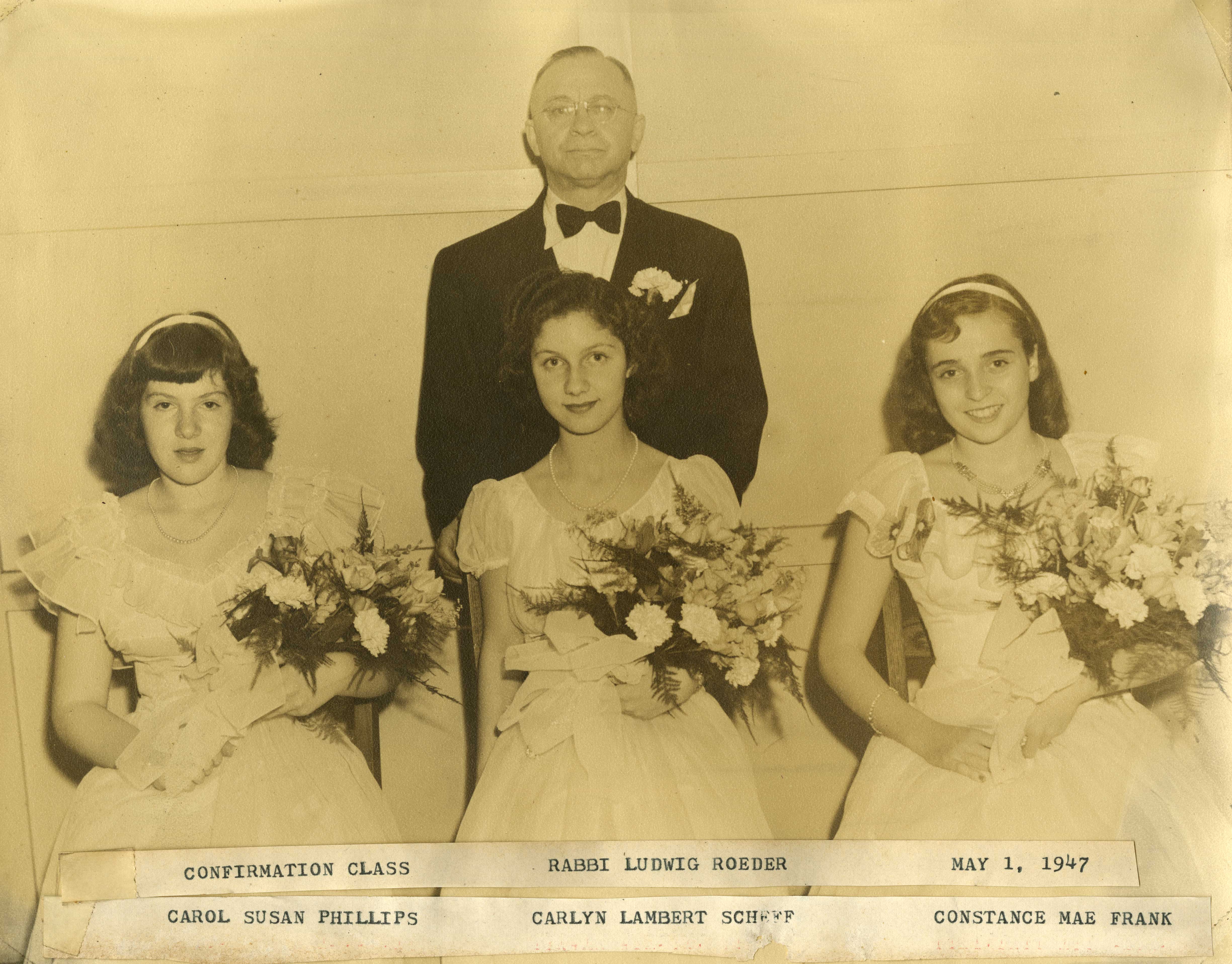 Rabbi Ludwig Roeder with his first confirmation class at Temple Israel, including (front row, left to right) Constance May Frank, Carlyn Lambert Schiff and Carol Susan Phillips.