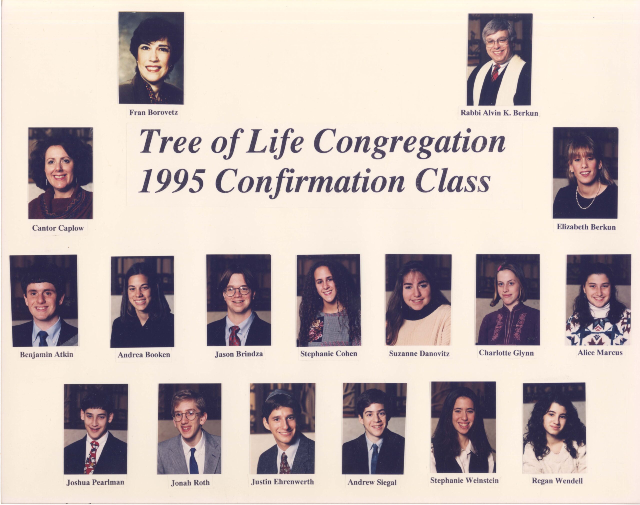Photograph of the 1995 confirmation class of Tree of Life Congregation of Pittsburgh. Pictured: Fran Borovetz, Rabbi Alvin K. Berkun, Cantor Caplowe, Elizabeth Berkun, Benjamin Atkin, Andrea Booken, Jason Brindza, Stephanie Cohen, Suzanne Danovitz, Charlotte Glynn, Alice Marcus, Joshua Pearlman, Jonah Roth, Justin Ehrenwerth, Andrew Siegal, Stephanie Weinstein, Regan Wendell.