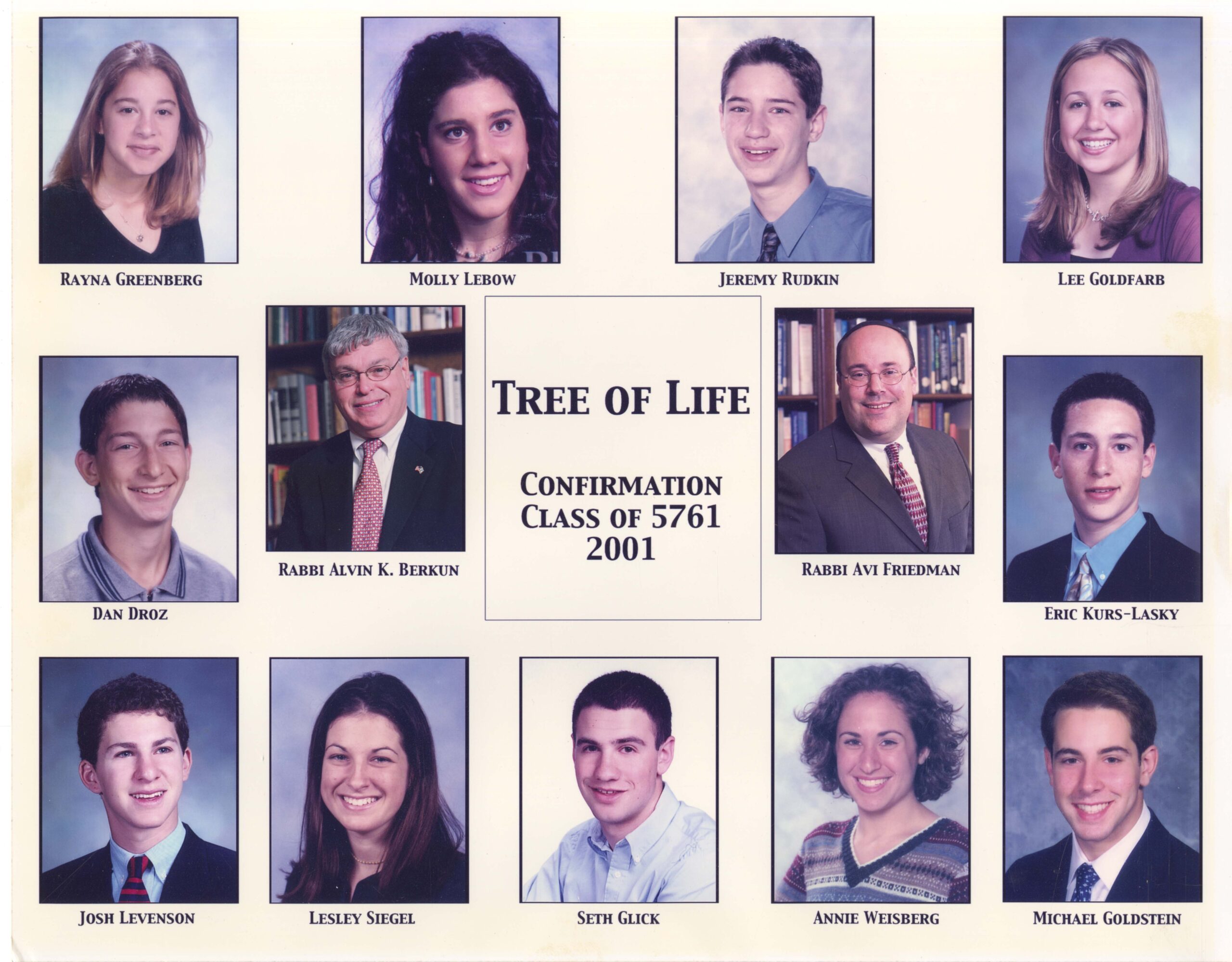 Photograph of the 2001 confirmation class of Tree of Life Congregation of Pittsburgh. Pictured: Rayna Greenberg, Molly Lebow, Jeremy Rudkin, Lee Goldfarb, Dan Droz, Rabbi Alvin K. Berkun, Rabbi Avi Friedman, Eric Kurs-Lasky, Josh Levenson, Lesley Siegel, Seth Glick, Annie Weisberg, Michael Goldstein.