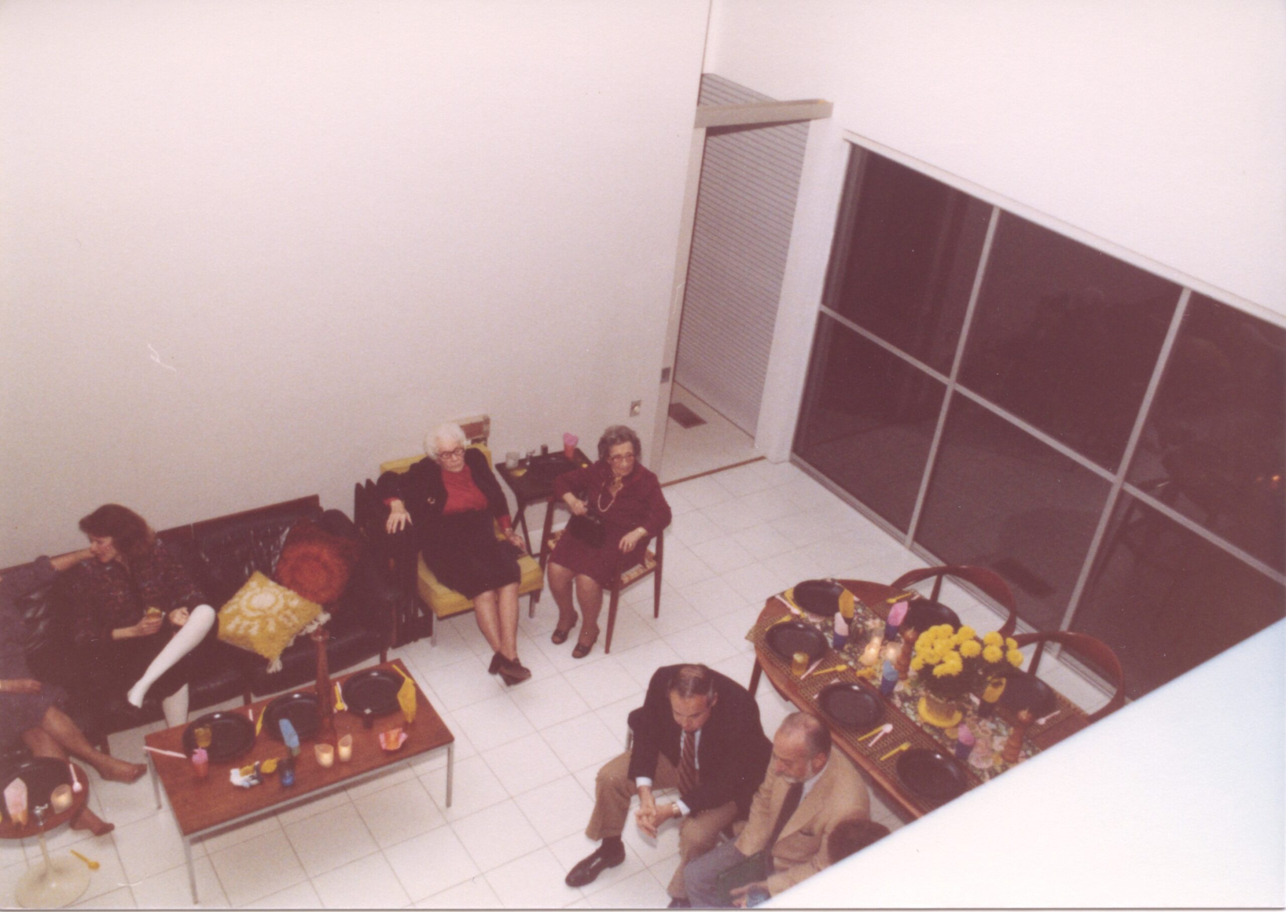 Photograph of party guests sitting in the living room of the Abrams house on Woodland Road. Helen Ohringer (left) and Esse Abrams (right) can be seen sitting in the chairs on the right.