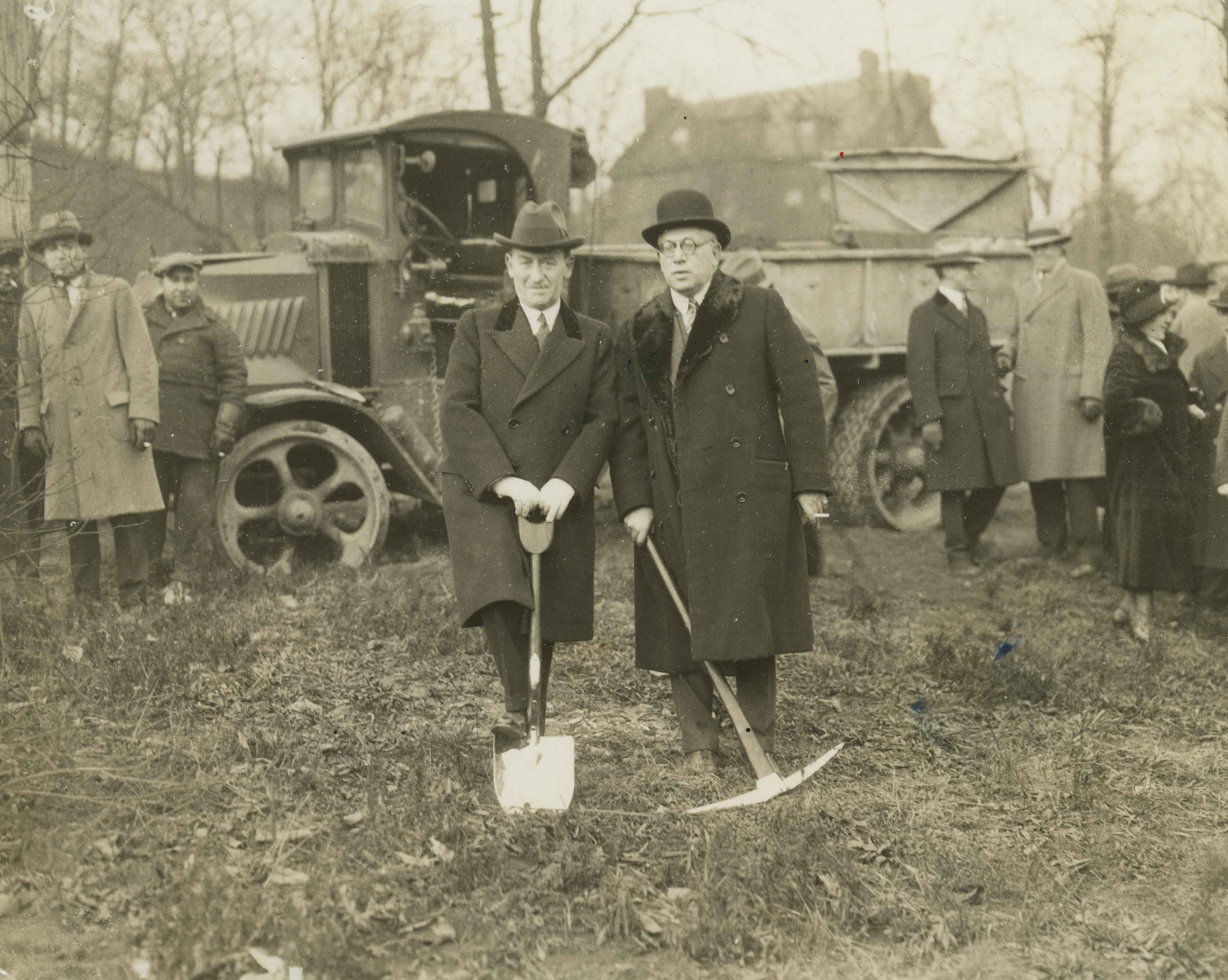 Albert C. Lehman (right) and Nathaniel Spear (left) at the ground-breaking ceremonies for the new Montefiore Hospital on Fifth Avenue in Oakland.