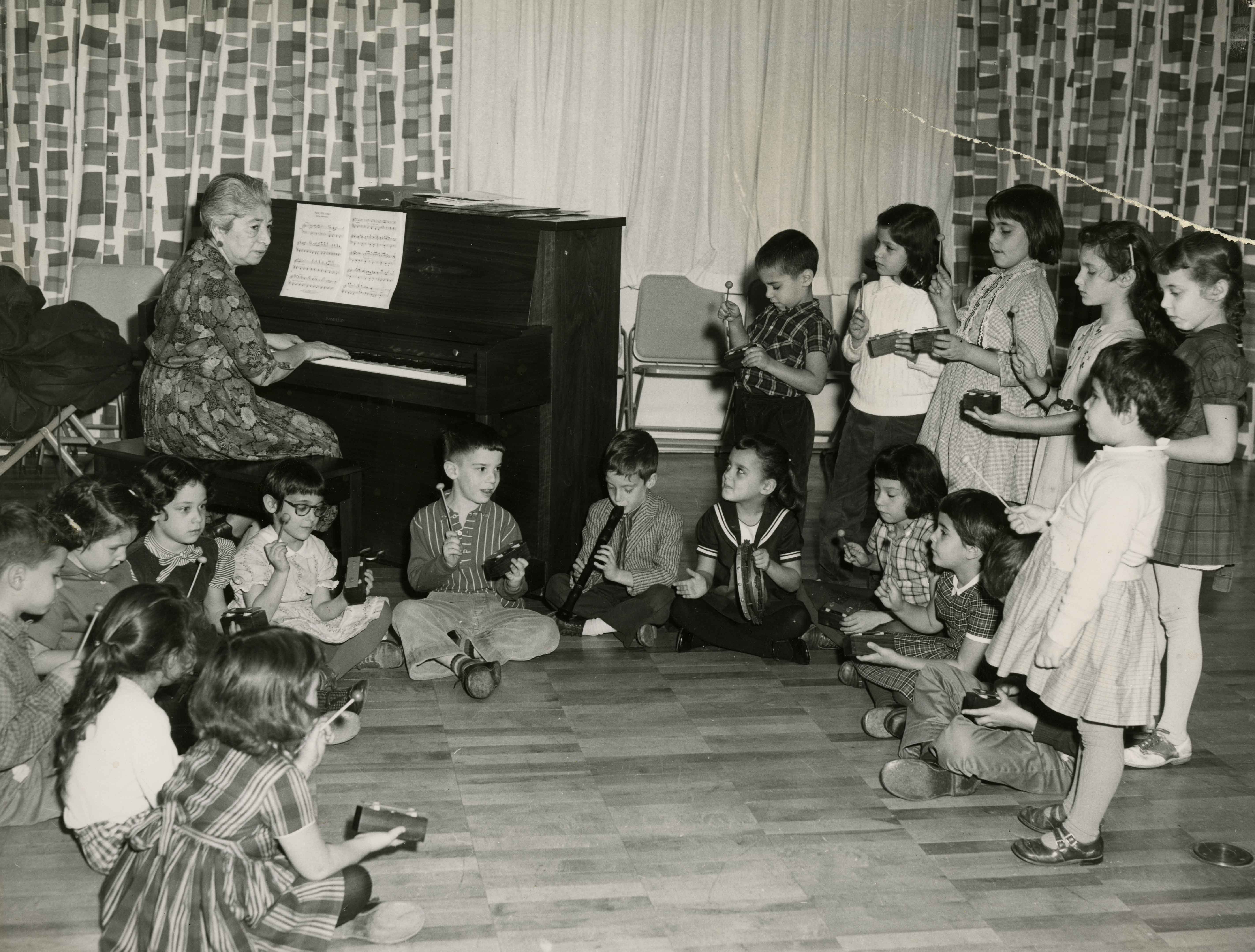Black and white photograph of Anna Laufe Perlow leading a music lesson for children at the Y-IKC. Date undated Identifier MSP389_B029_F001_I01 Collection Jewish Community Center Records Source Rauh Jewish Archives at the Heinz History Center Family The Laufe Family : View Family Member