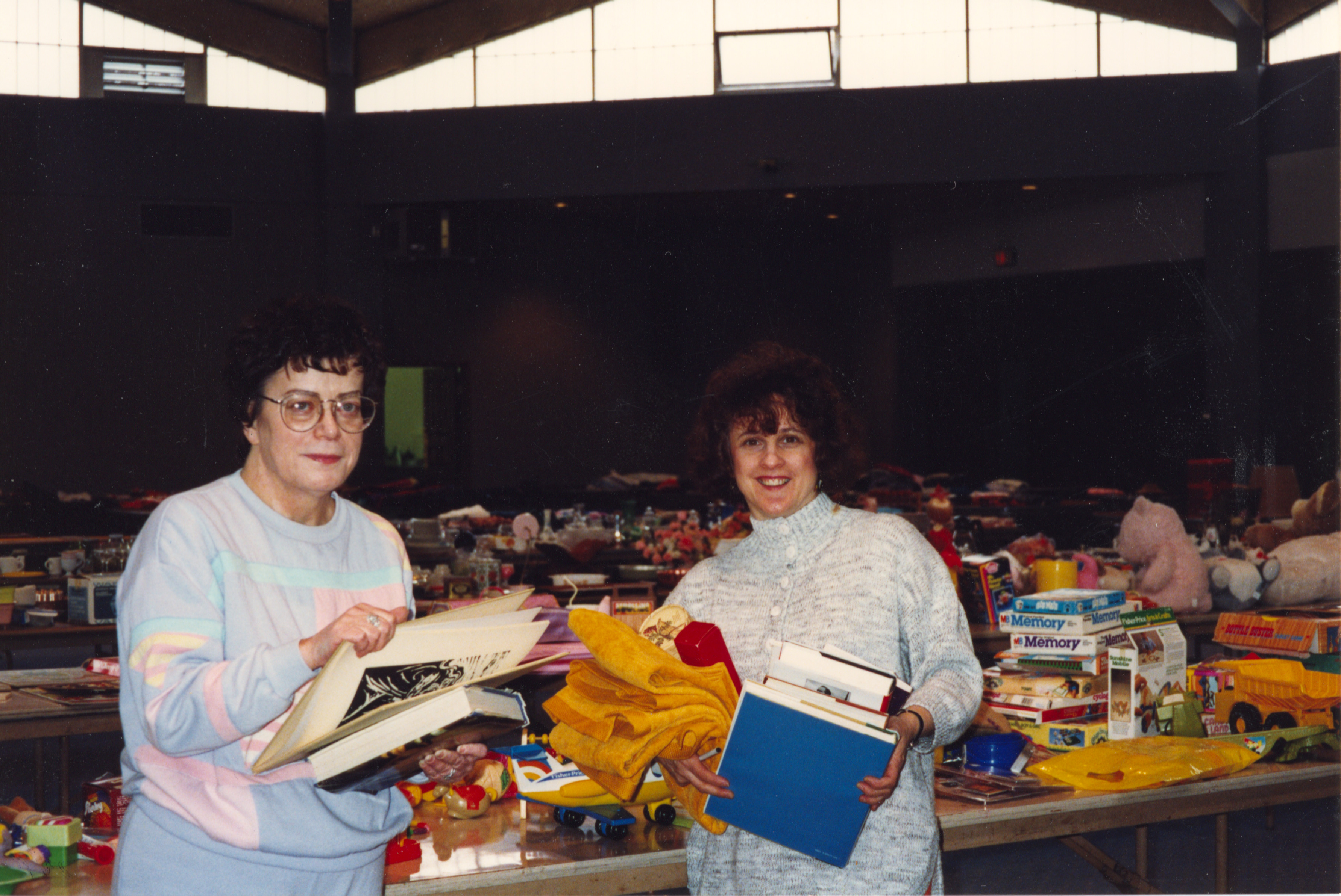 Color photograph of (left to right) Wendy Perilman and Marilyn Charap preparing the Sisterhood flea market. Date 1992 Identifier MSS_1380_B023_Sisterhood_I01 Collection Beth El Congregation of the South Hills Records [MSS 1380] Source Rauh Jewish Archives at the Heinz History Center