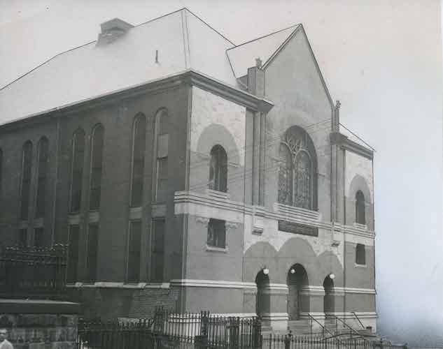 Photograph showing front and side of Beth Hamedrash Hagodol synagogue on Washington Street in the Hill District of Pittsburgh. Black and white photograph, includes some retouching.