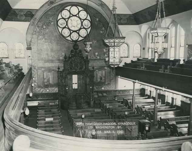 Photograph of main sanctuary of Beth Hamedrash Hagogol synagogue on Washington Street in the Hill District of Pittsburgh. Label reads “Beth Hamedrish Hagodal Synagogue, 129 Washington St., Fire Loss Mar. 5, 1960.”