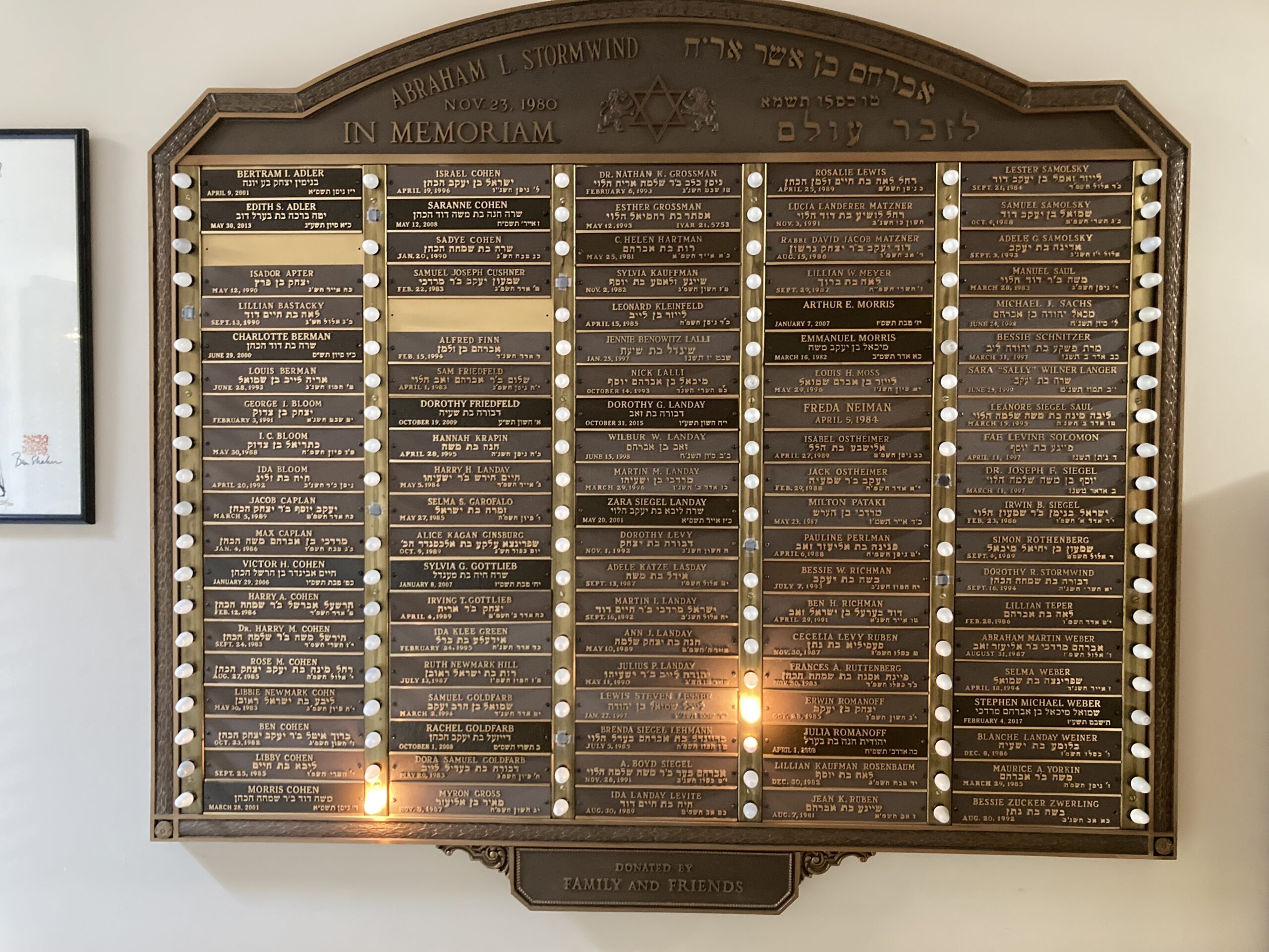 Memorial plaque from Beth Israel Congregation in Washington, Pa. Dedicated to Abraham I. Stormwind by “his family and friends.” Surnames listed include Adler, Apter, Bastacky, Berman, Bloom, Caplan, Cohen, Cohn, Cushner, Finn, Friedfield, Garofalo, Ginsburg, Goldfarb, Gottlieb, Green, Gross, Grossman, Hartman, Hill, Kauffman, Kleinfeld, Krapin, Lalli, Landay, Langer, Lasday, Lehmann, Lesser, Levite, Levy, Lewis, Matzner, Meyer, Morris, Moss, Neiman, Ostheimer, Pataki, Perlman, Richman, Romanoff, Rosenbaum, Rothenberg, Ruben, Sachs, Samolsky, Saul, Schnitzer, Siegal, Siegel, Solomon, Stormwind, Teper, Tuttenberg, Weber, Weiner, Yorkin, and Zwerling.