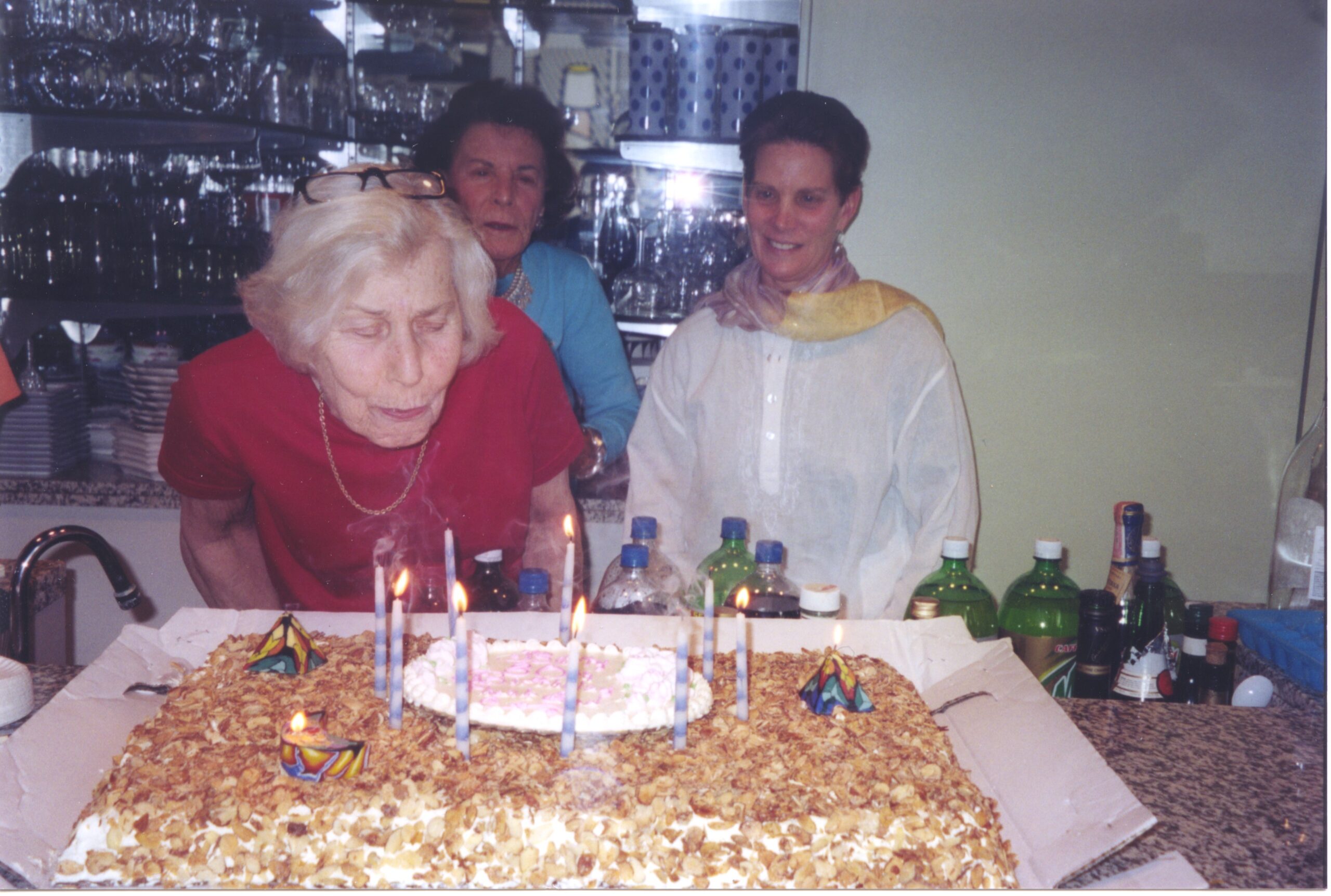 Photograph of Betty Abrams blowing out her birthday candles. Her sister Ruth Frank (left) and daughter Carol Hozid (right) are standing behind her.