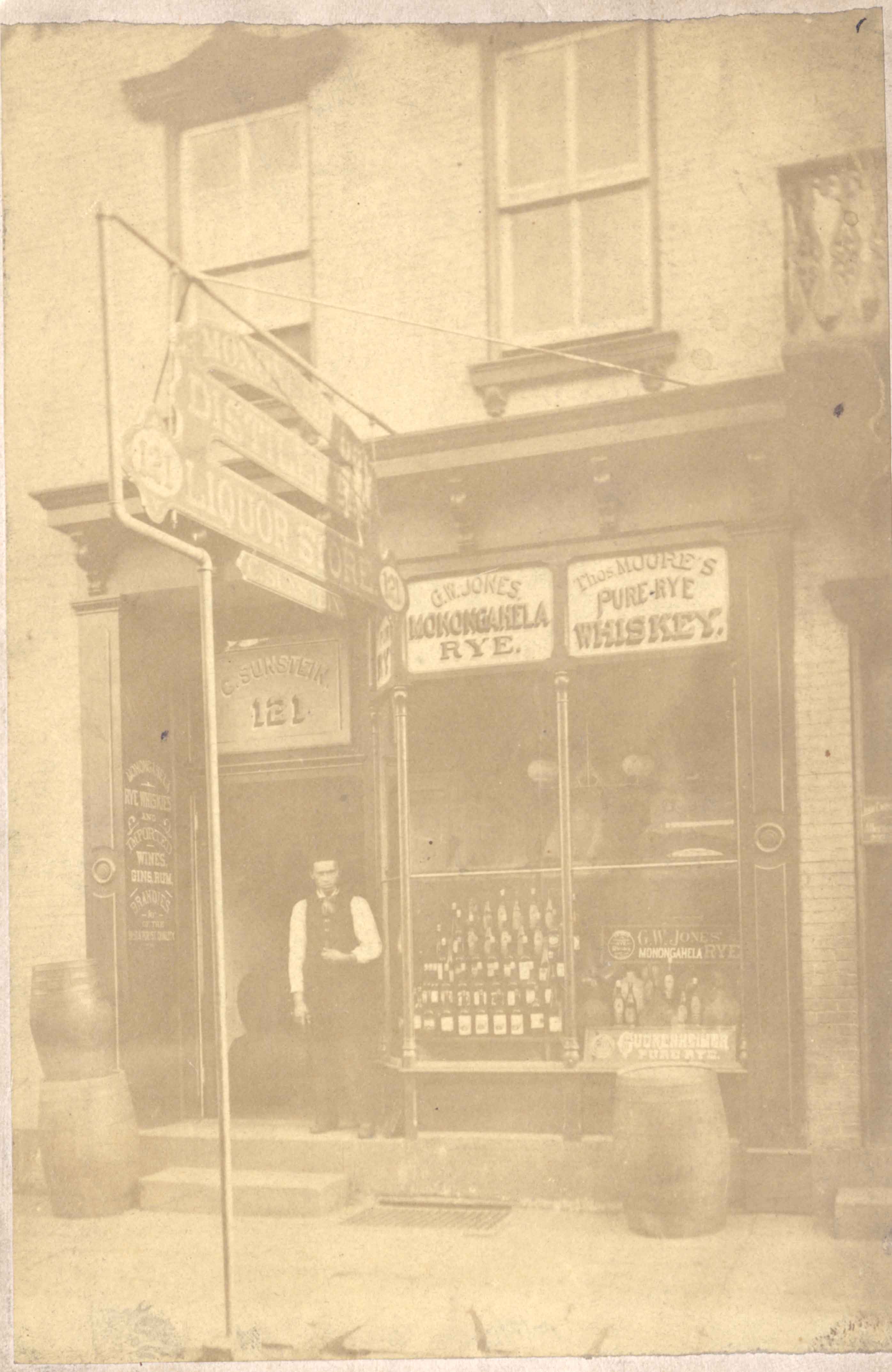 Cass Sunstein in front of his liquor store in downtown Pittsburgh. Date c.1895 Identifier MSS1037_B001_F003_I01 Collection Sunstein, Speyer and Kingsbacher Family Papers and Photographs Source Rauh Jewish Archives at the Heinz History Center Family The Sunstein Family : View Family Member
