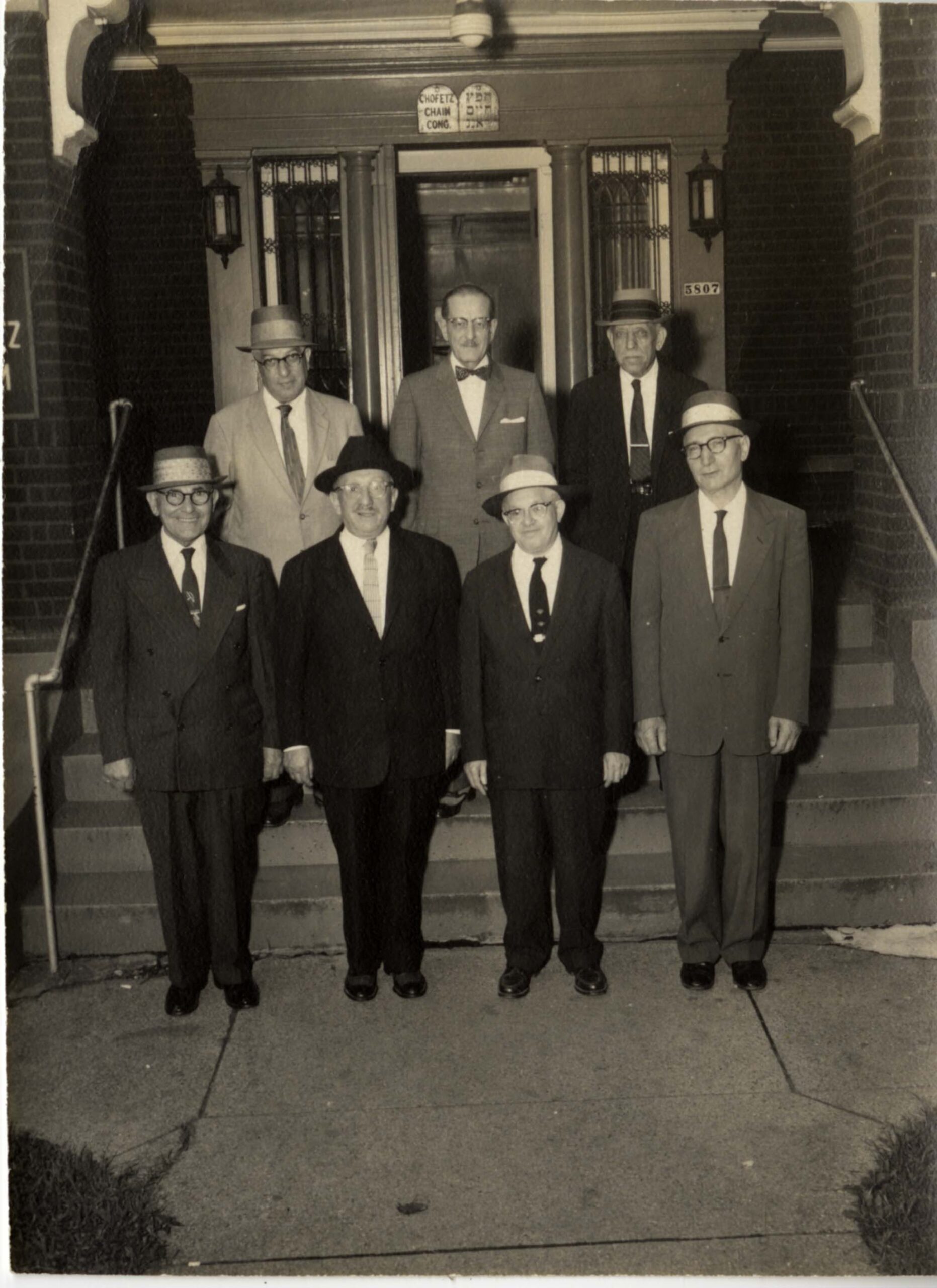 Photograph showing members of the Chofetz Chaim Congregation anniversary committee standing in front of the synagogue. Pictured (left to right) R. Weiss, N. Katz, I. Katz, H. E. Steinfeld, I. Swerling, H. Levite.
