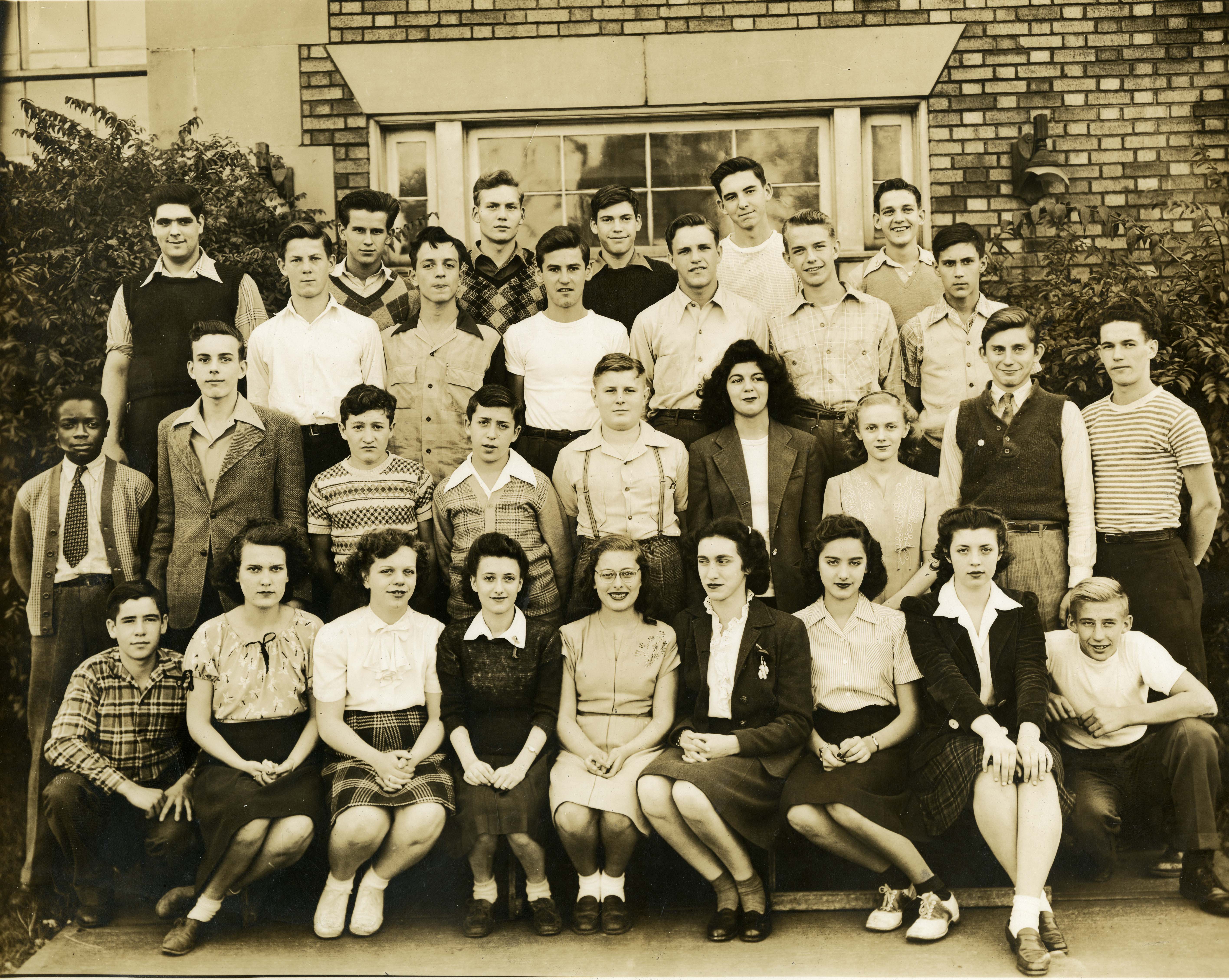 Clairton maintained a small Jewish population through World War II. The class of 1948, seen here in their sophomore year, included at least two Jewish students, Audrey Recht and Meida Moscowitz (front row, sixth and seventh from left).