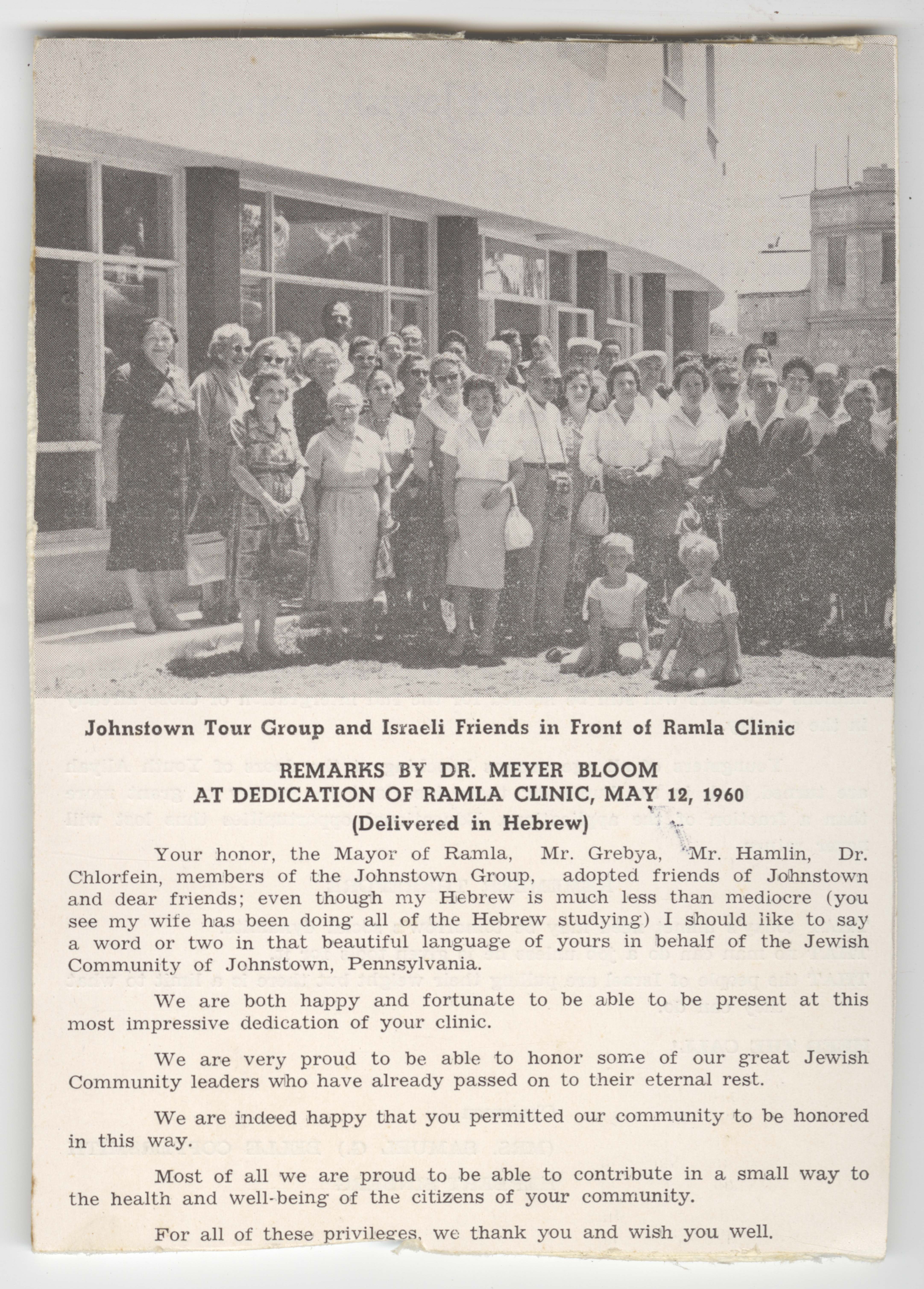 Black and white photograph of the Johnstown tour group and Israel friends in front of the Ramala Clinic in Israel and remarks by Dr. Meyer Bloom at the clinic’s dedication.