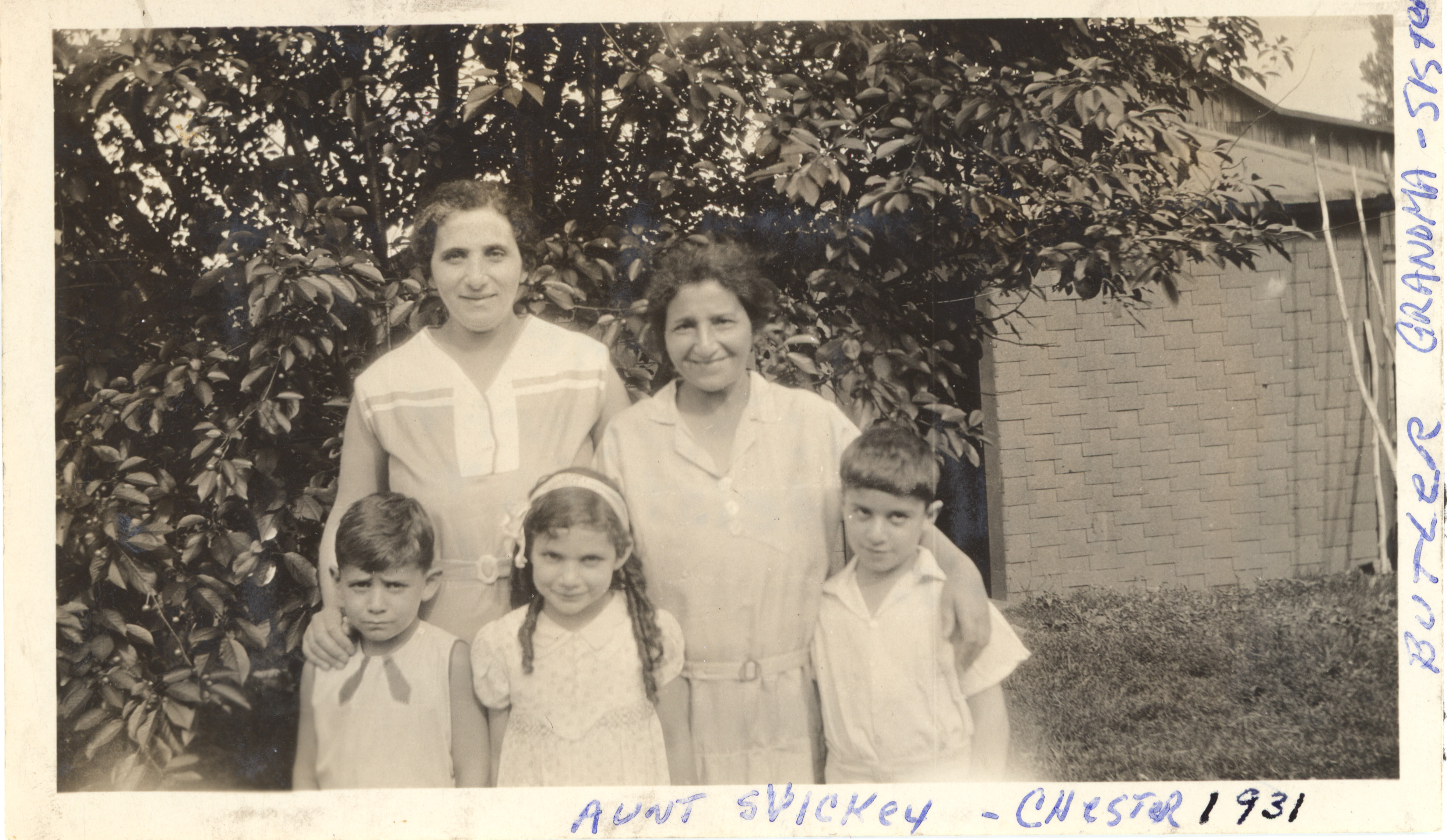 Black and white photograph of (adults from left to right ) Lillian Charlson Edelstein, Lillians sister Cecilia Aaron, (children from left to right) Robert Edelstein, Shirley Edelstein, and Chester Aaron posing outside while visiting Butler, Pa.