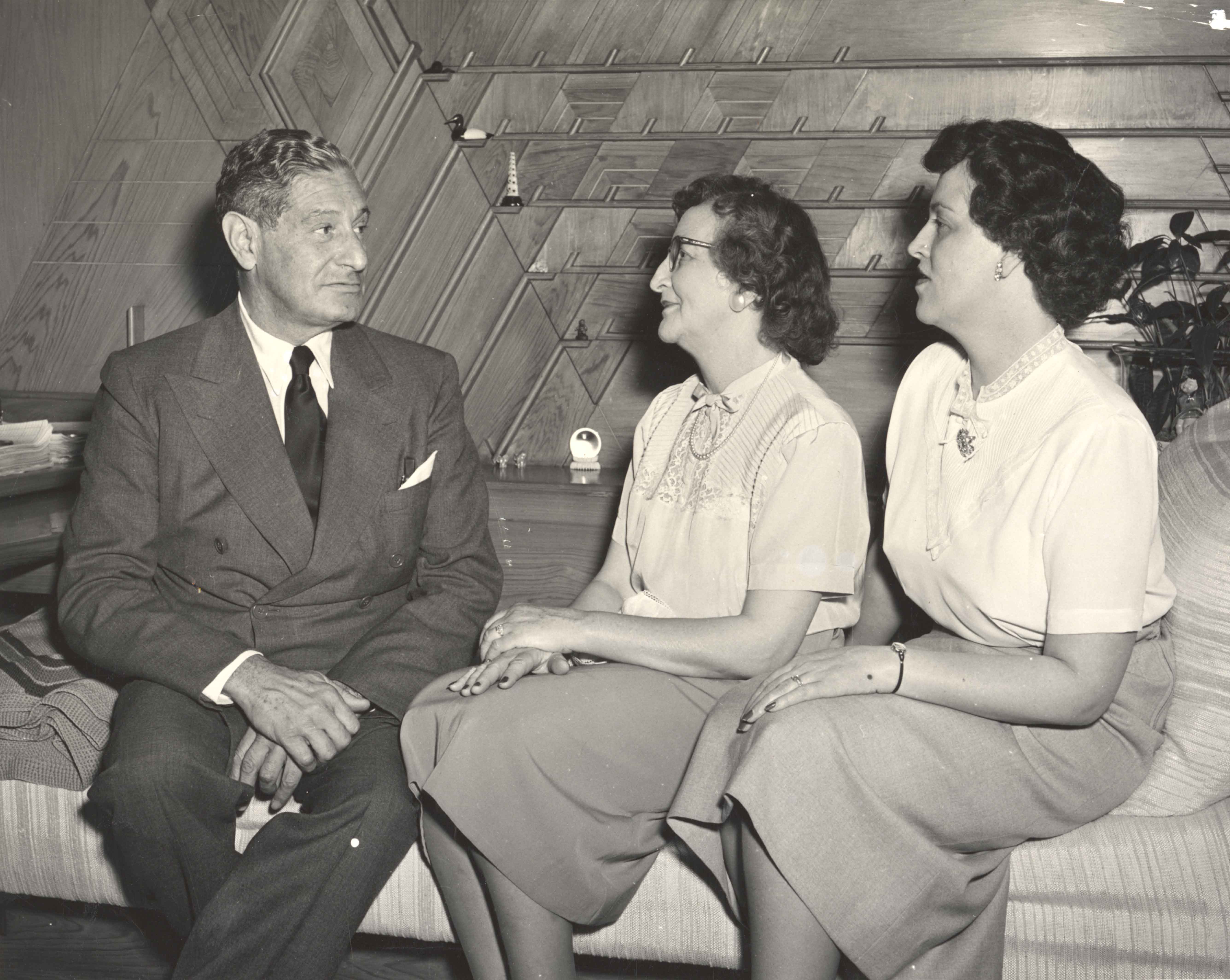 Edgar Kaufmann speaking with associates in his office designed by Frank Lloyd Wright. Date undated Identifier MSP371_B010_F008_I01 Collection Kaufmann’s Department Store Photographs Source Rauh Jewish Archives at the Heinz History Center Family The Kaufmann Family : View Family Member