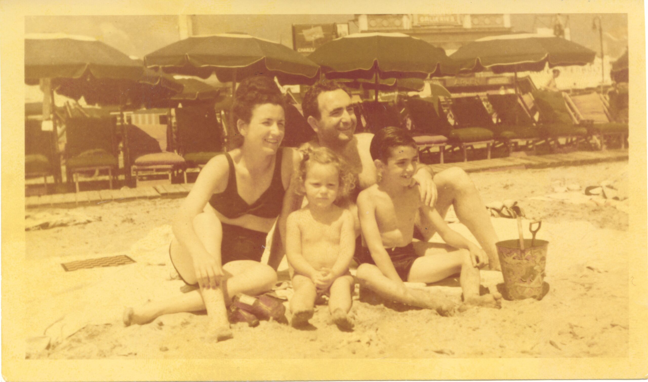 Photographs of (left to right) Shiffie Swartz, Lynne Swartz, Harry Eisenfeld and Arnold Eisenfeld on the beach.
