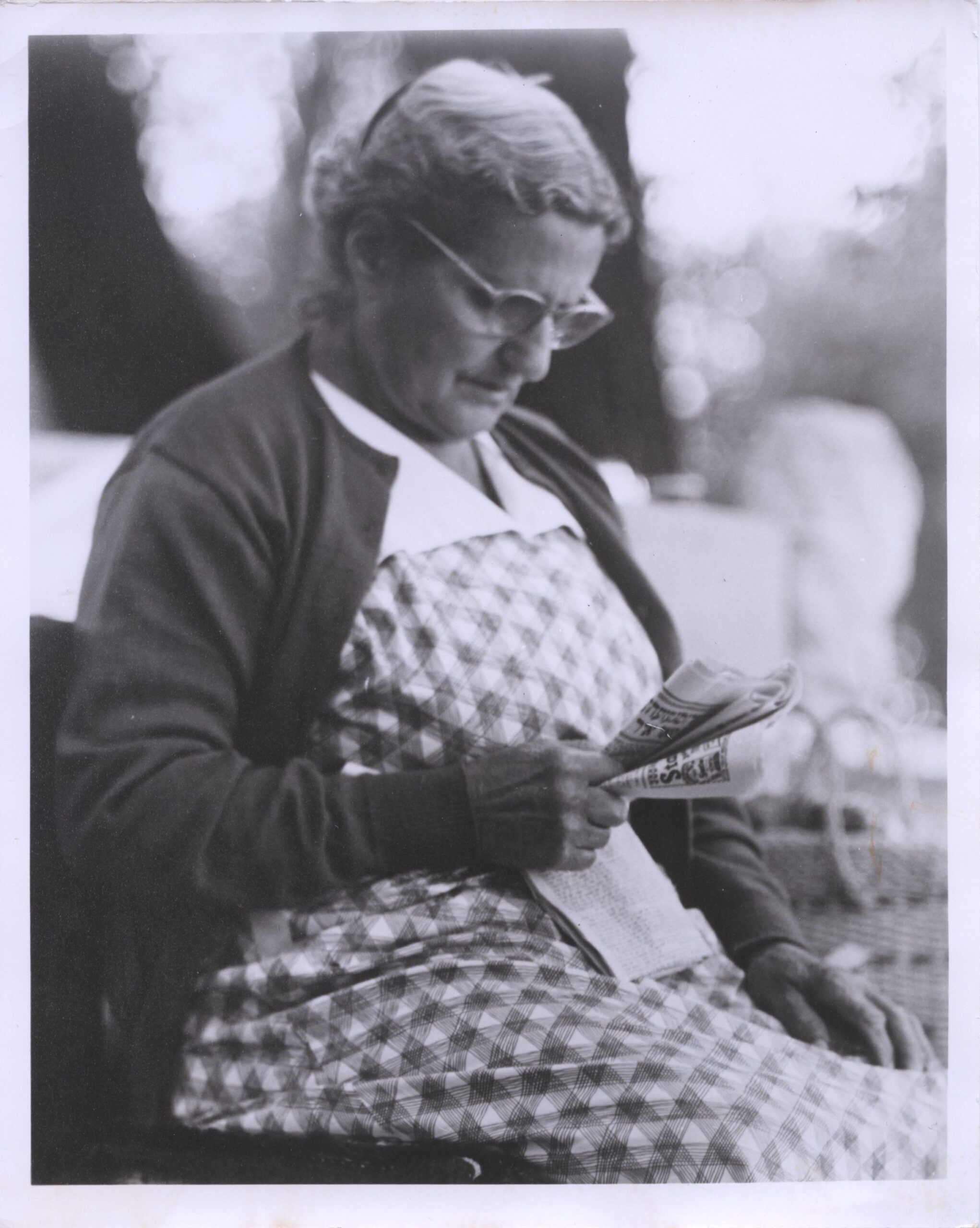 Black and white photograph of Elkie (Alice) Blistein reading the Forward. Date undated Identifier MSS_1241_B001_F014_I01 Collection Hurwitz and Blistein Family Papers and Photographs [MSS 1241] Source Rauh Jewish Archives at the Heinz History Center