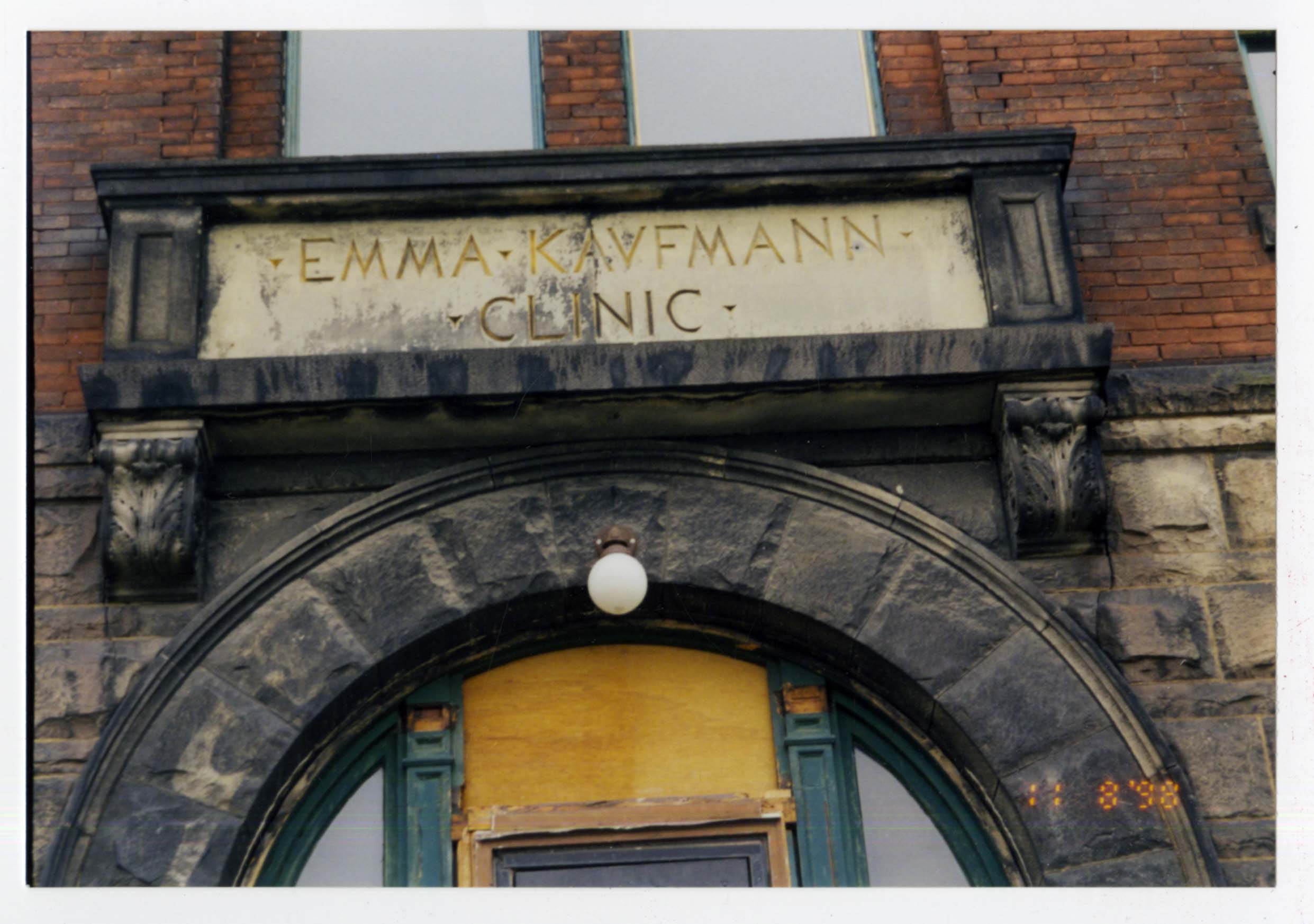 Photograph showing entrance of Emma Kaufmann Clinic with engraved nameplate. Date November 8, 1998 Identifier MSS775_B001_F027_I02 Collection Gerald Sapir Papers and Photographs [MSS 775] Source Rauh Jewish Archives at the Heinz History Center
