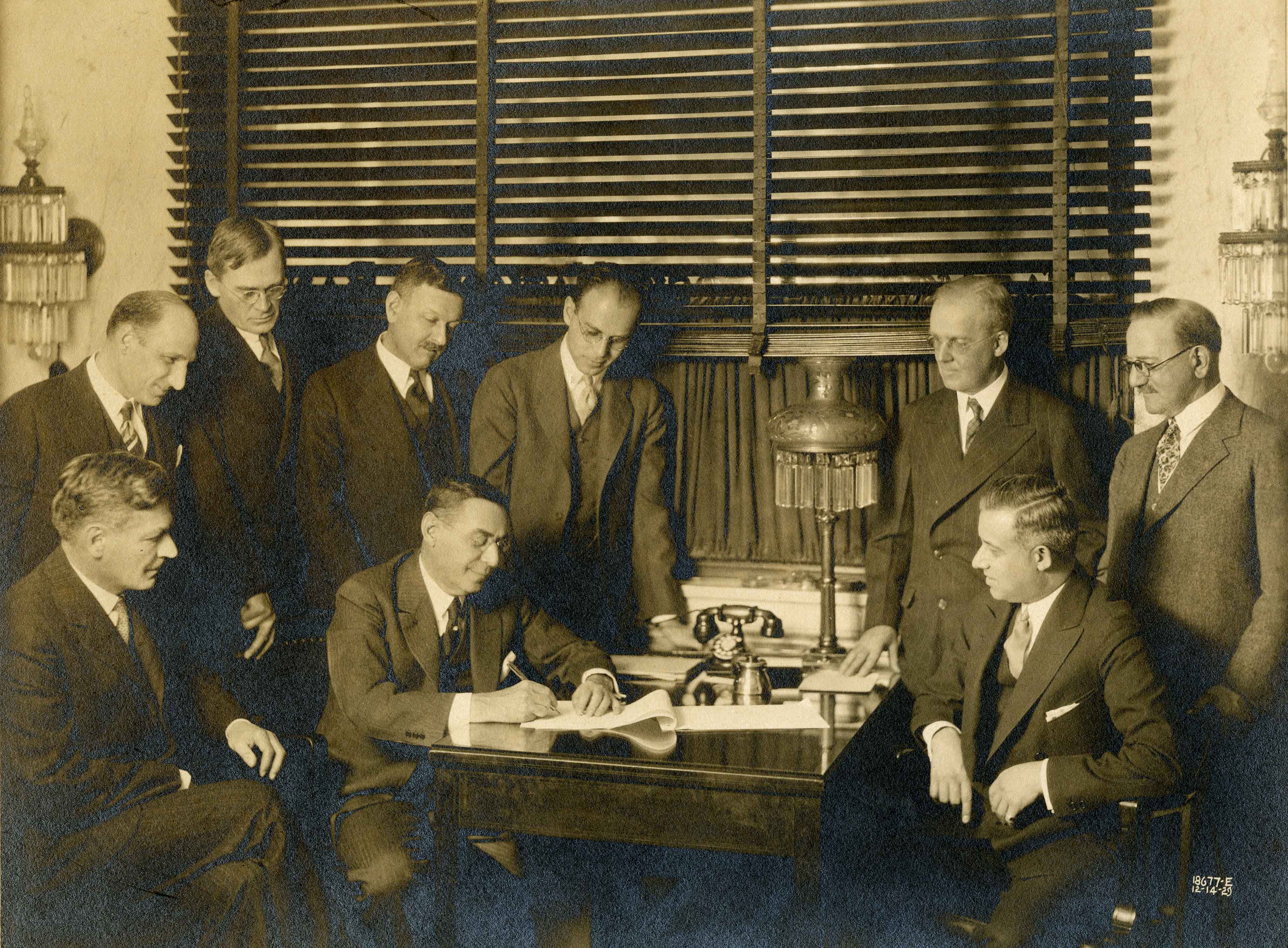 Maurice Falk signing the Articles of Agreement for the Maurice and Laura Falk Foundation with his secretary I. A. Simon (seated across from him), attorney Eugene Strassburger (standing third from left) and attorney A. Leo Weil (standing far right).