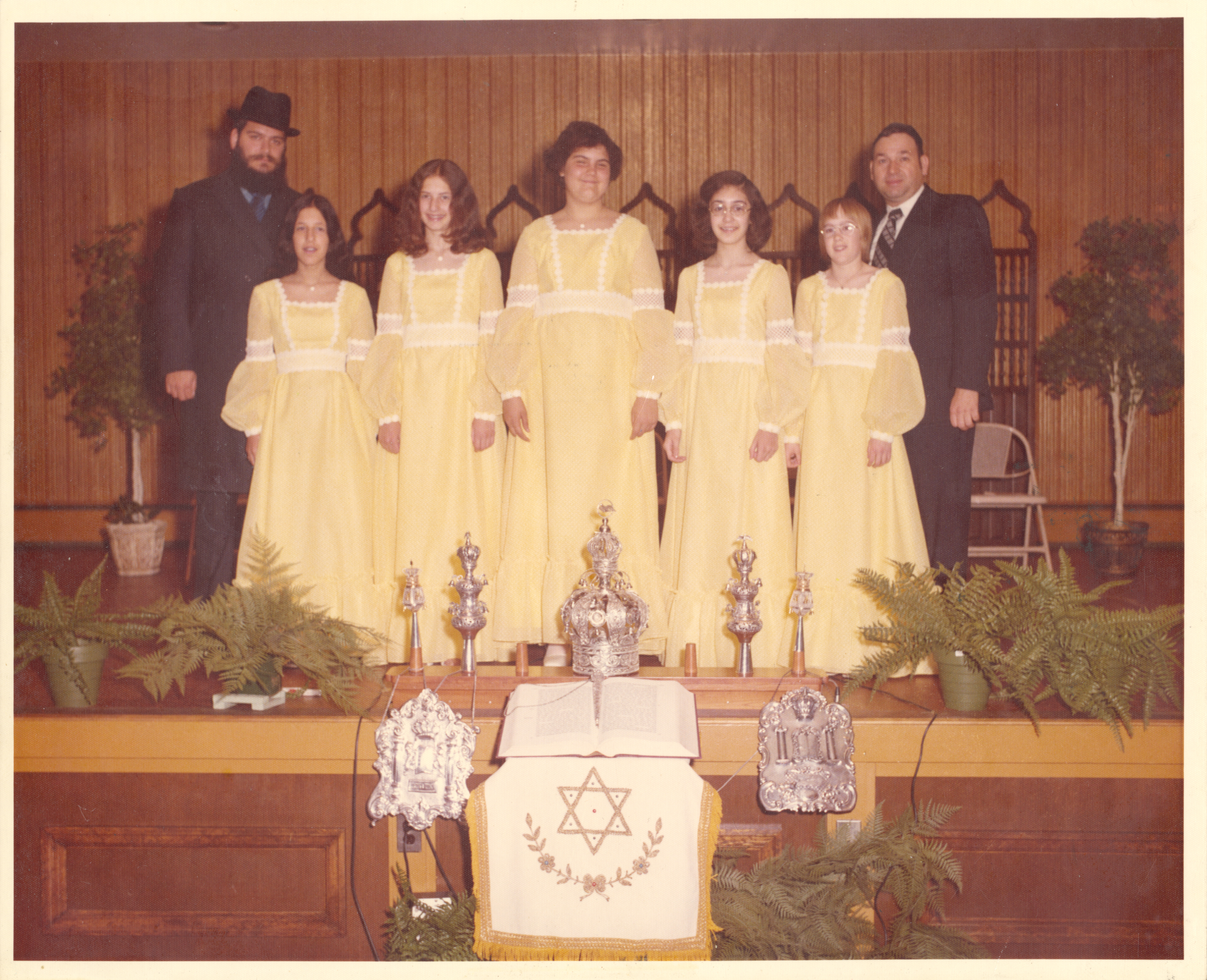 (Left to right) Rabbi Lefkowitz, Ruth Elias, Barbara Spiegel, Rachel Small, Randi Joshowitz, Martha Serbin, and Rabbi Chinn. Date 1974 Identifier MSS_1314_B016_I23 Collection Gemilas Chesed Congregation (White Oak, Pa.) Records [MSS 1314] Source Rauh Jewish Archives at the Heinz History Center