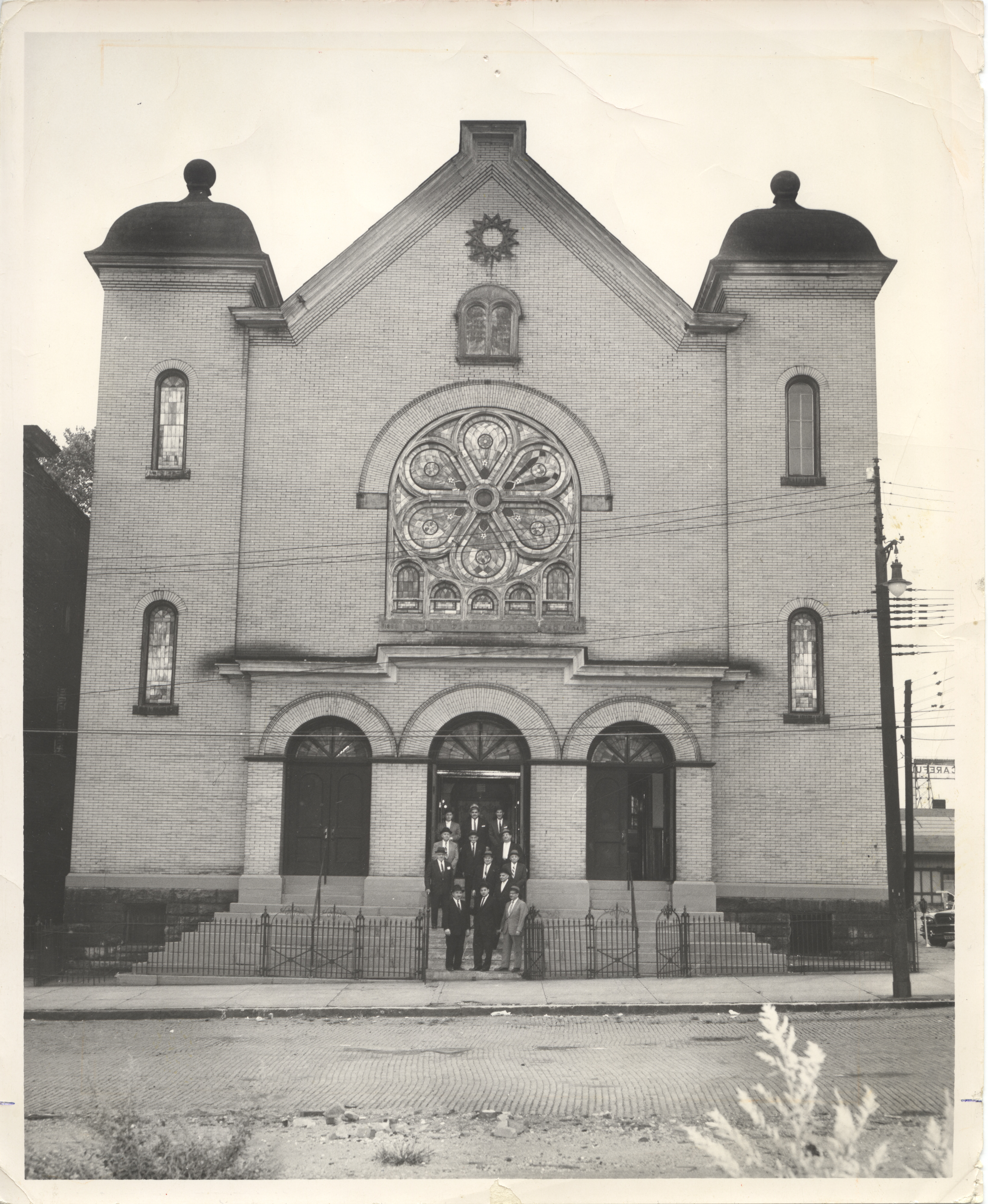 Photograph of congregation members standing at the entrance of Gemilas Chesed Synagogue located at Third Avenue and Market Street in McKeesport, Pa.
