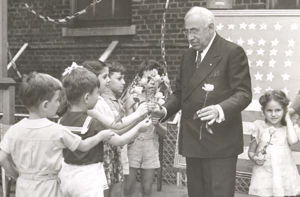 Kaufmann’s Department Store founder “Uncle Henry” Kaufmann giving flowers to children at the Irene Kaufmann Settlement House on the occasion of his 80th birthday.