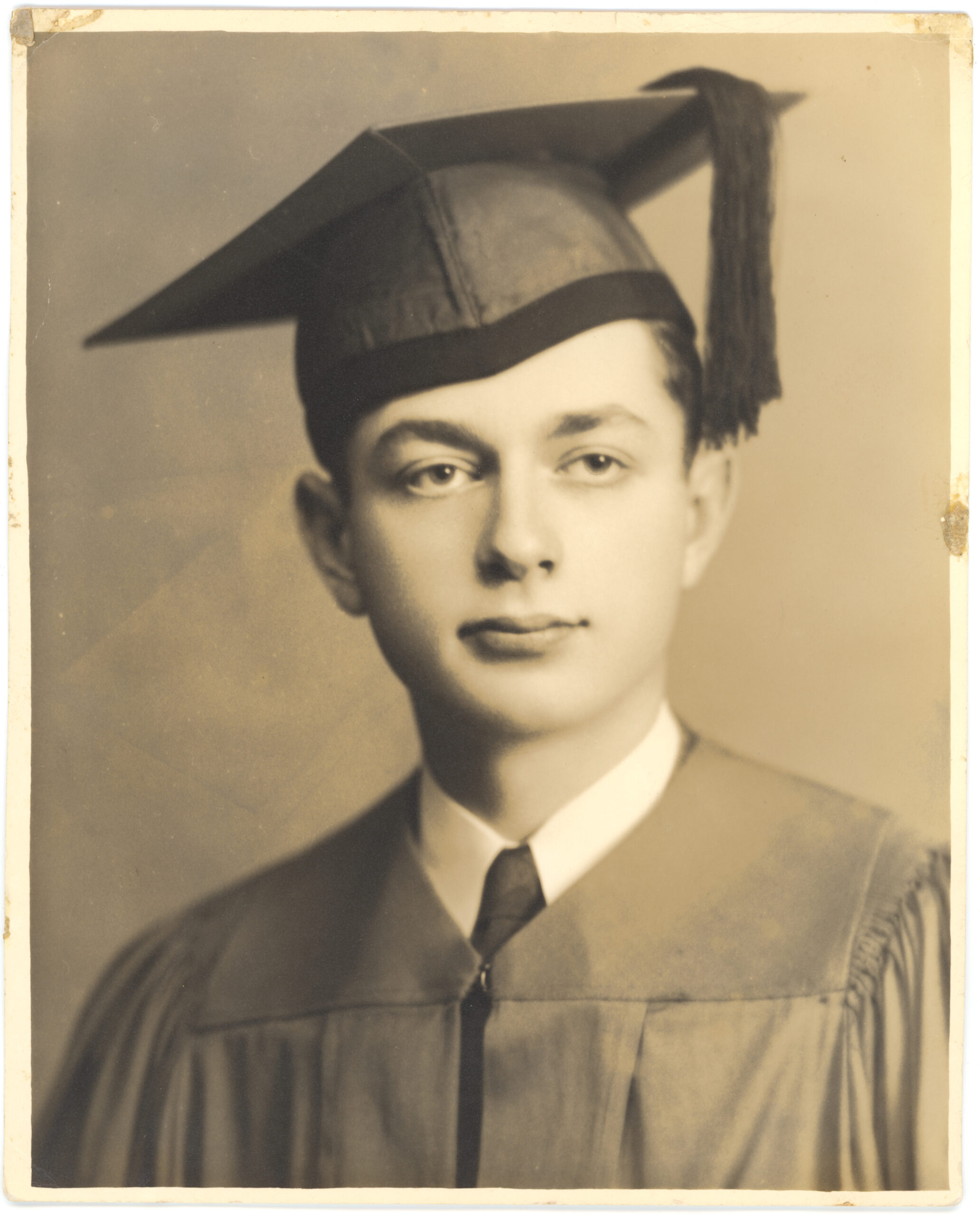 Sepia toned photograph of Herbert Mandel posing in his high school graduation cap and gown. Date 1941 Identifier MSS_1353_B001_F002_I02 Collection Herbert Mandel Papers and Photographs [MSS 1353] Source Rauh Jewish Archives at the Heinz History Center