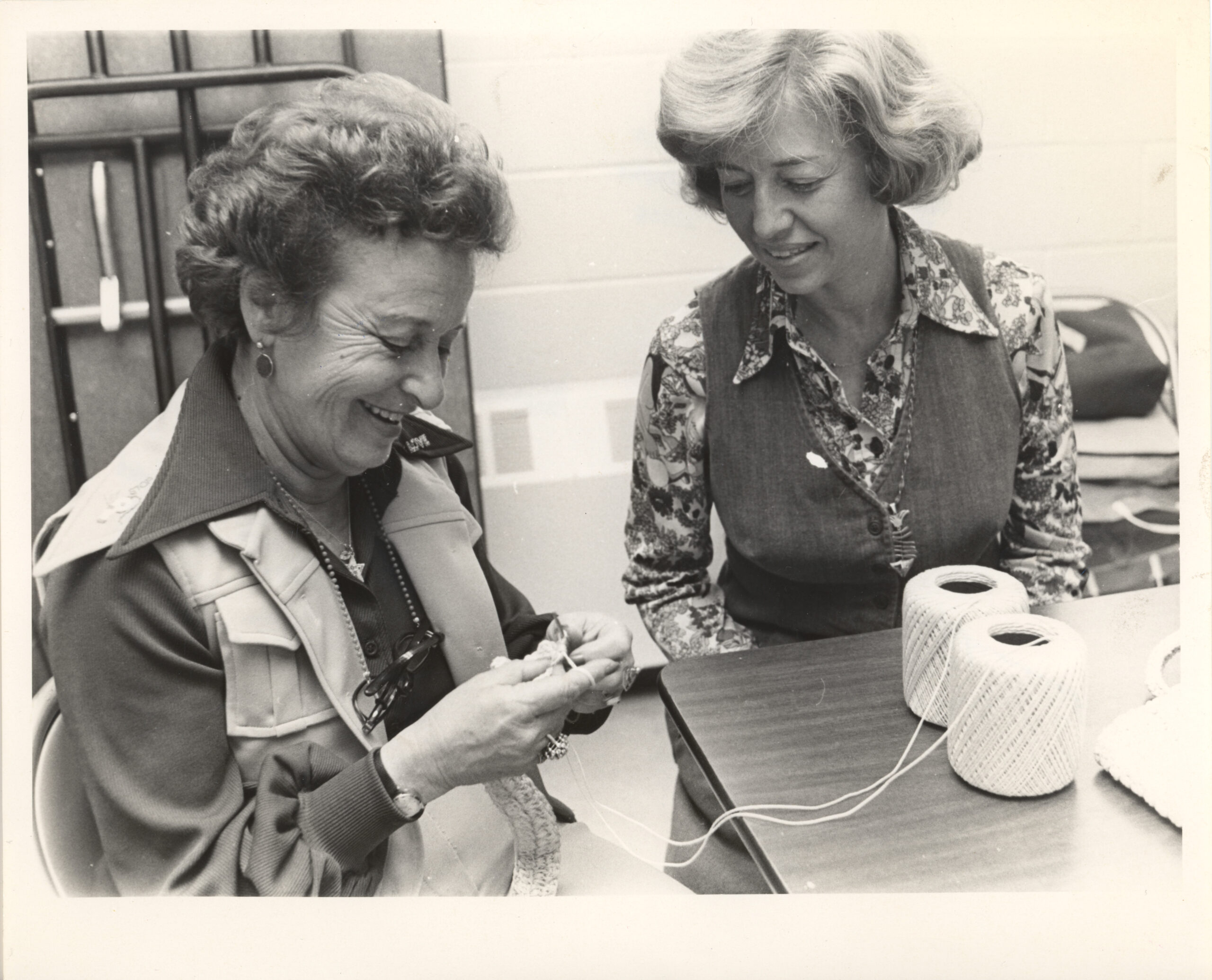 Black and white photograph of (from right to left) Jeanne Schimmel and Doris Rosenberg crocheting during “Explorations in Needlework” Seminar series conducted by the Nassau County Department of Recreation and Parks for 30 needlework teachers. Jeanne was a featured presenter at the event.