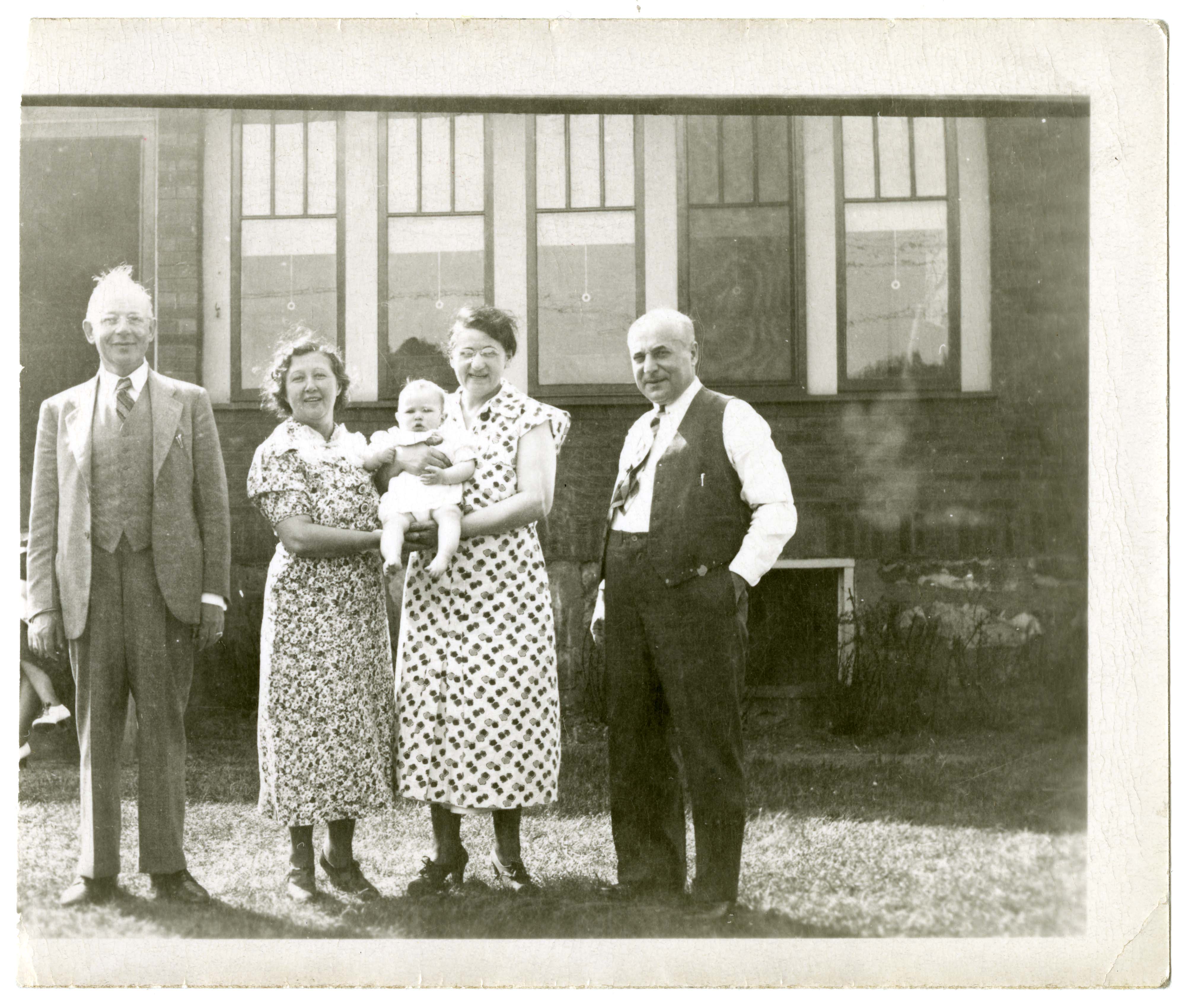 Black and white photograph of (from left to right) David, Ray, and Norman Karp visiting Sylvia Berman and Abraham Berman in Altoona, Pa.