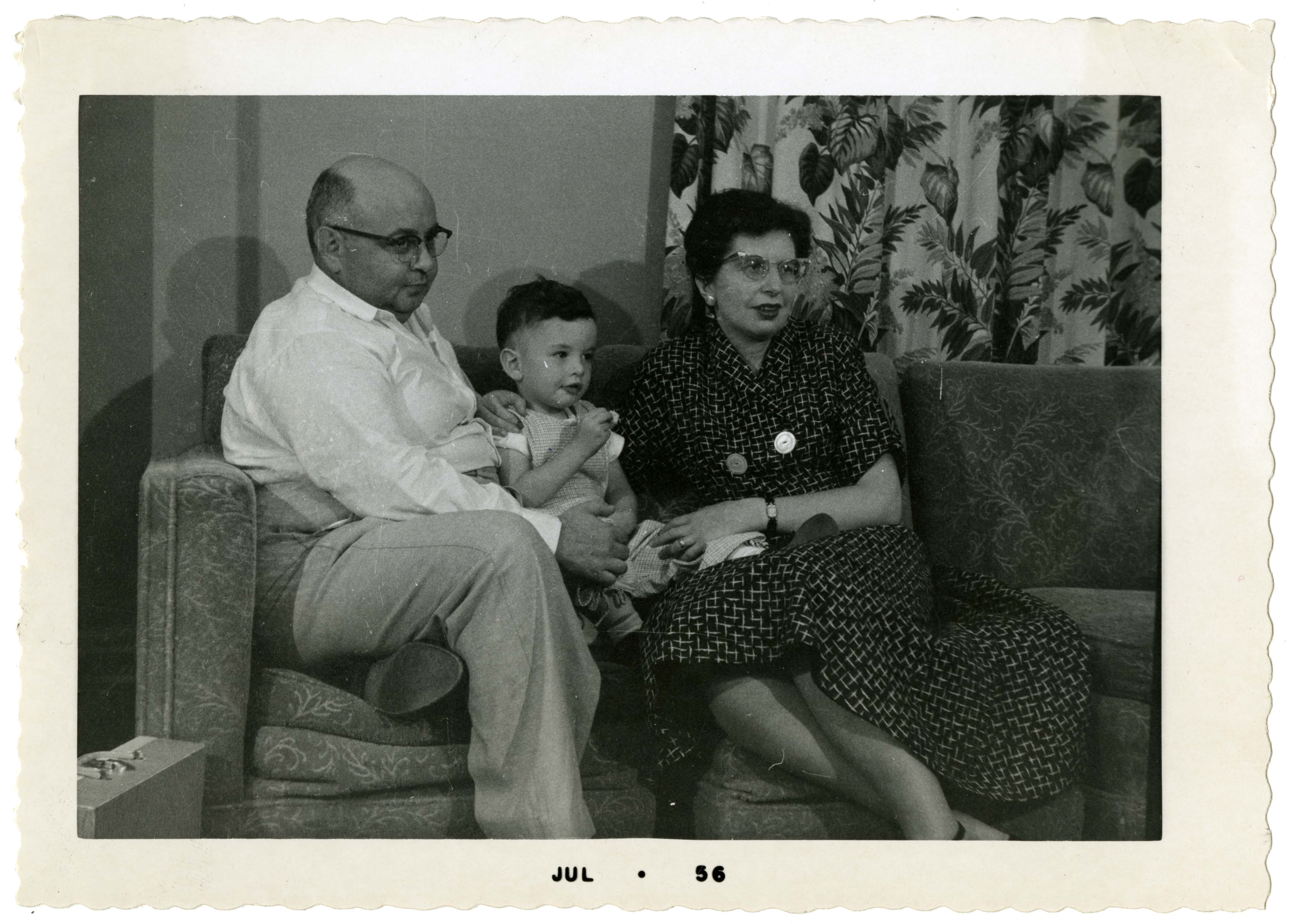Black and white photograph of Elchan, David Paul, and Sylvia Karp at their home in Barnesboro, Pa. Date 1956 Identifier MSS_1100_B001_F003_I01 Collection Karp Family Papers and Photographs [MSS 1100] Source Rauh Jewish Archives at the Heinz History Center
