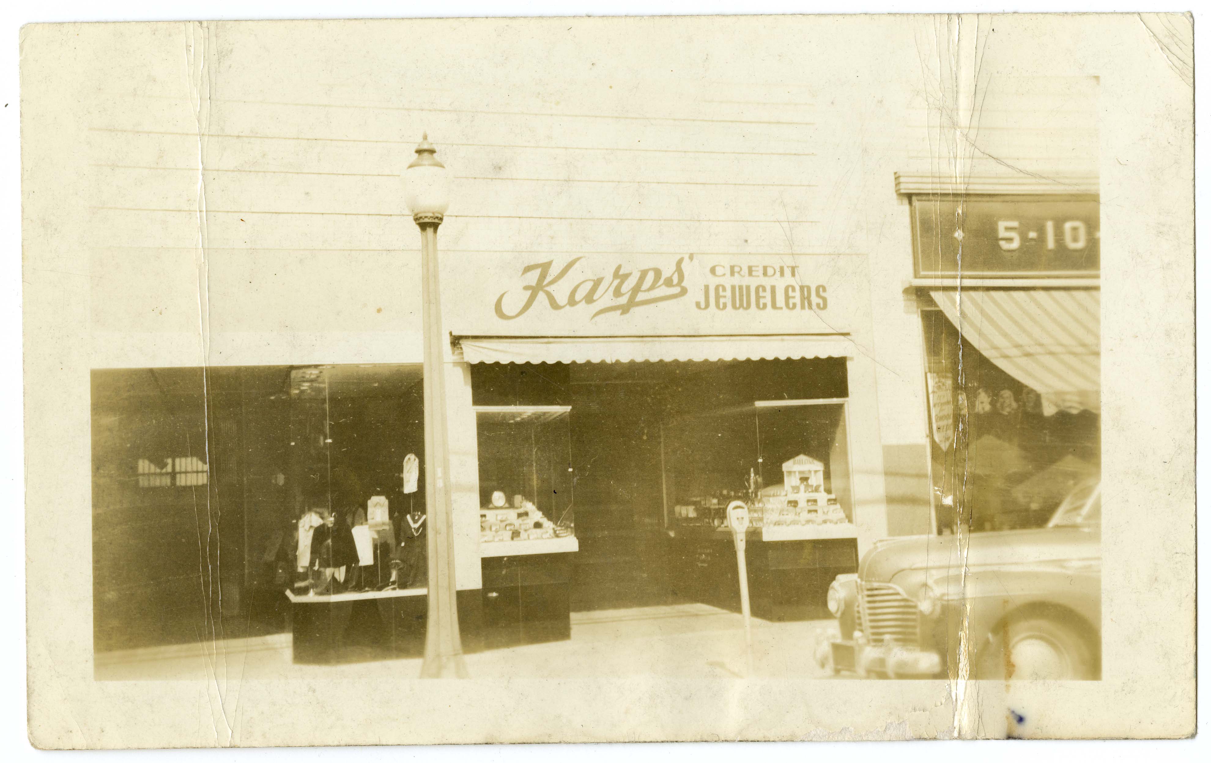 Sepia toned photograph of the storefront of Karp’s Jewelry Store in Tarentum, Pa. Date 1940s Identifier MSS_1100_B001_F010_I01 Collection Karp Family Papers and Photograph Source Rauh Jewish Archives at the Heinz History Center