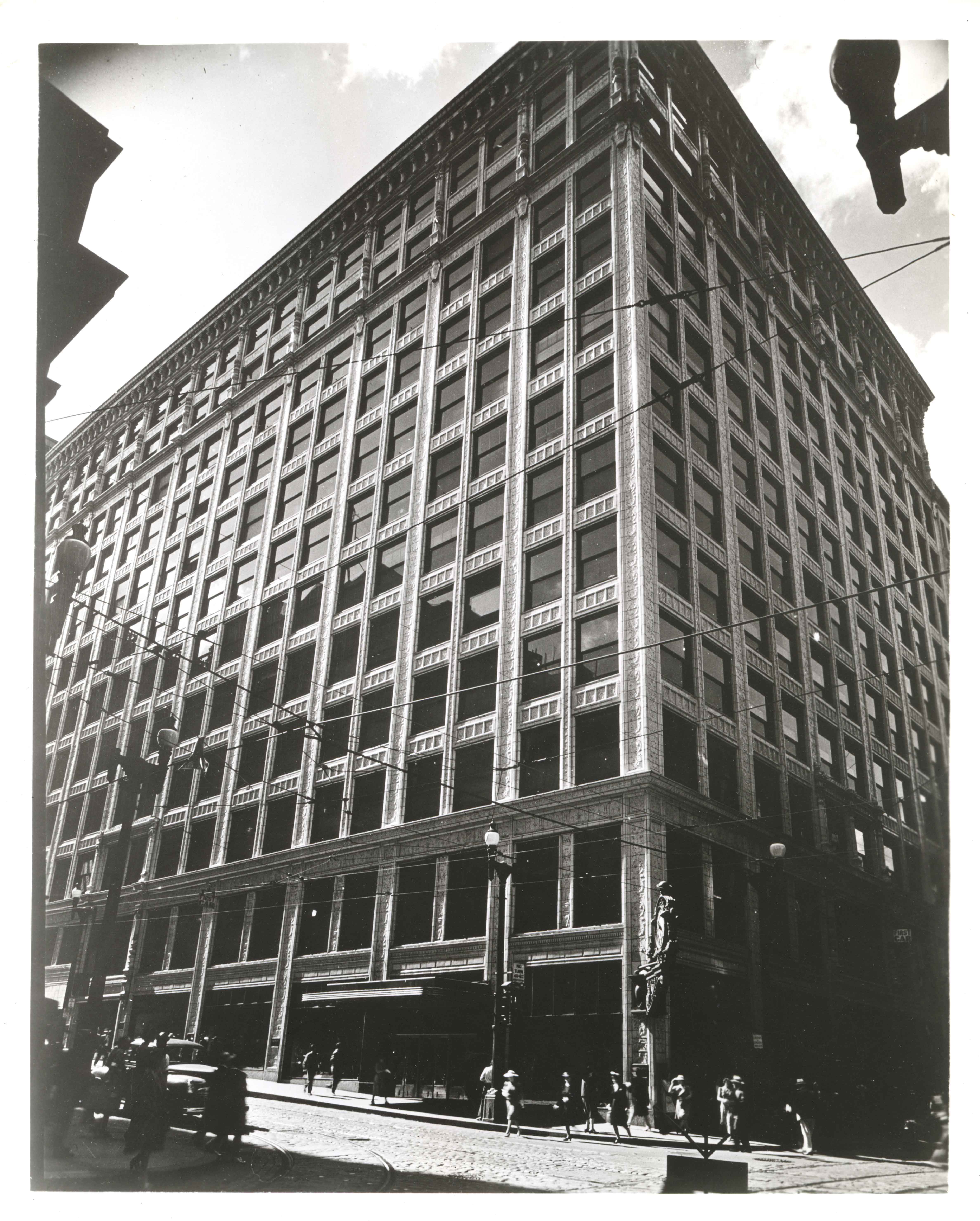 The flagship Kaufmann’s Department Store on Smithfield Street in downtown Pittsburgh, with the iconic clock in the lower right.