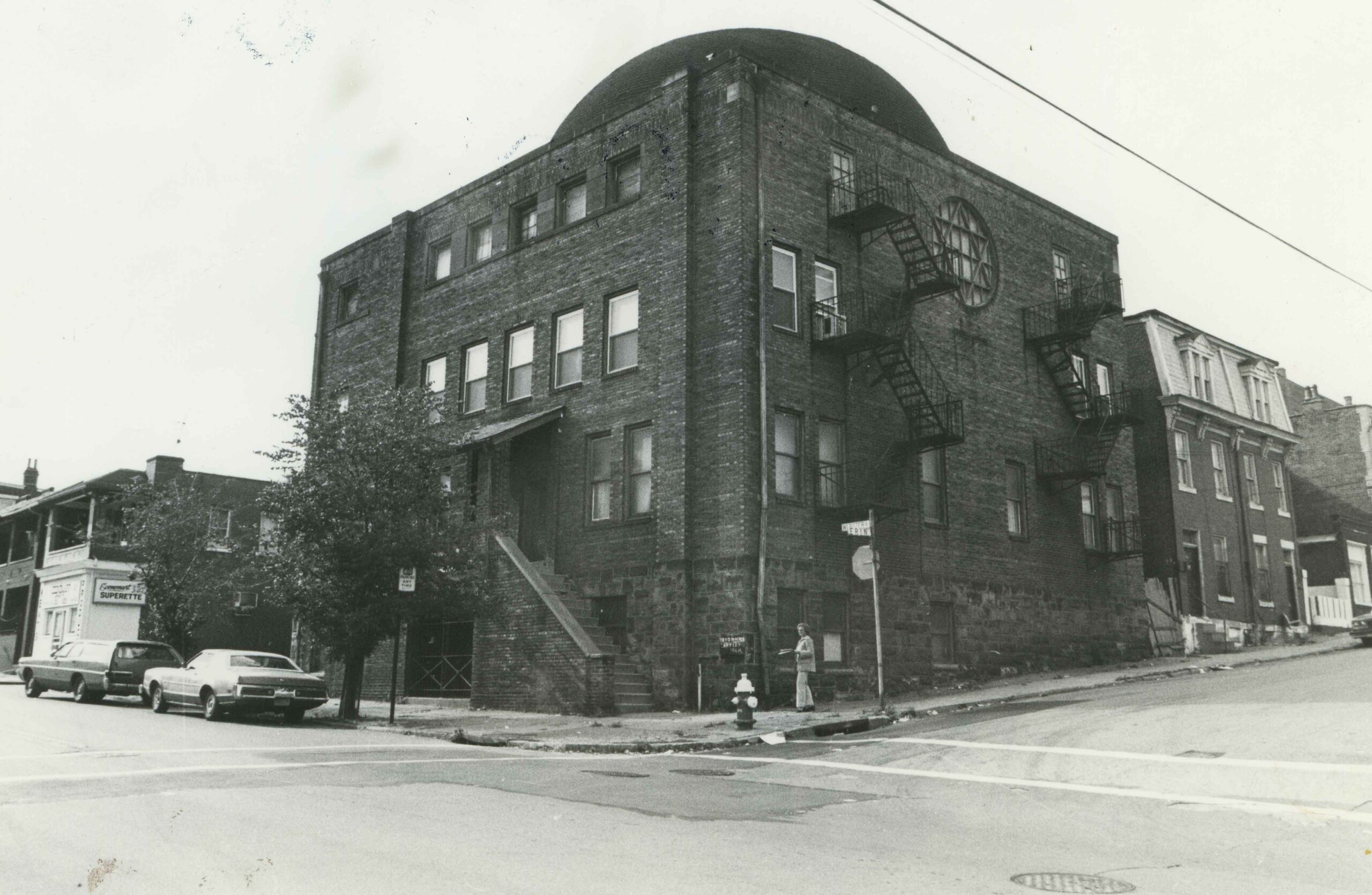 Photograph showing the former Kether Torah Congregation synagogue at the corner of Webster Avenue and Erin Street in the Hill District.