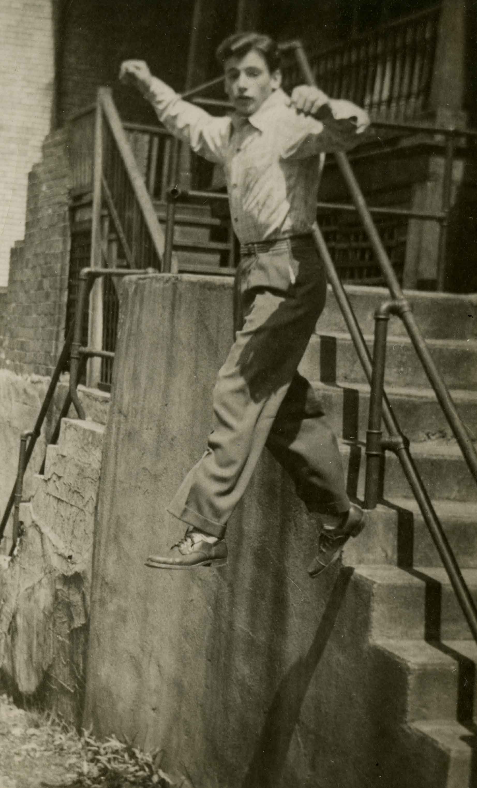 A teenage Leonard Schwartz jumping from steps, presumably near his home in the Hill District. Date c.1940 Identifier MSS739_B001_F018_I01 Collection Leonard Schwartz Papers and Photographs Source Rauh Jewish Archives at the Heinz History Center Family The Leonard and Millie Schwartz Family : View Family Member
