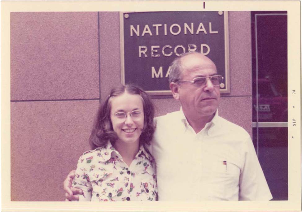 Color photograph of (left to right) Louise Silk and her father, Howard Shapiro, standing outside of National Record Mart. Date 1974 Identifier 2024.XXXX Collection Louise Silk Papers and Photographs [MSS 13266] Source Rauh Jewish Archives at the Heinz History Center