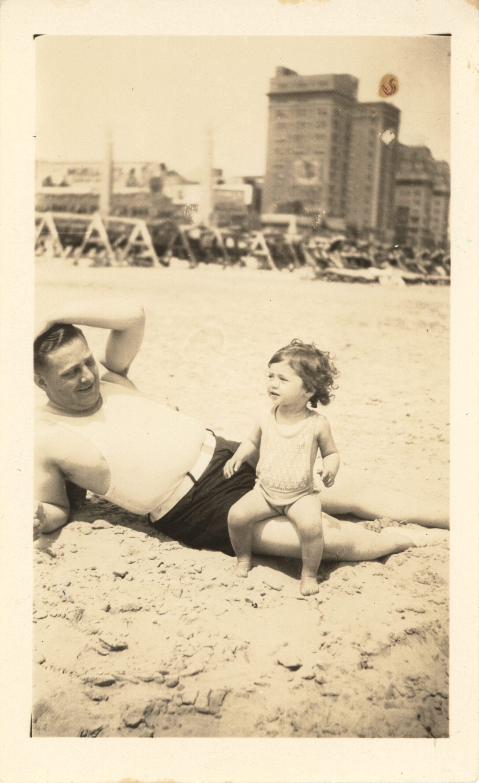 Black and white photograph of Max Fischman and his daughter Jeanne on the beach in Atlantic City, New Jersey. Date 1930 Identifier acc_2024.0111_B001_I21 Collection Fischman, Klein, and Schimmel Papers and Photographs [2024.0111] Source Rauh Jewish Archives at the Heinz History Center