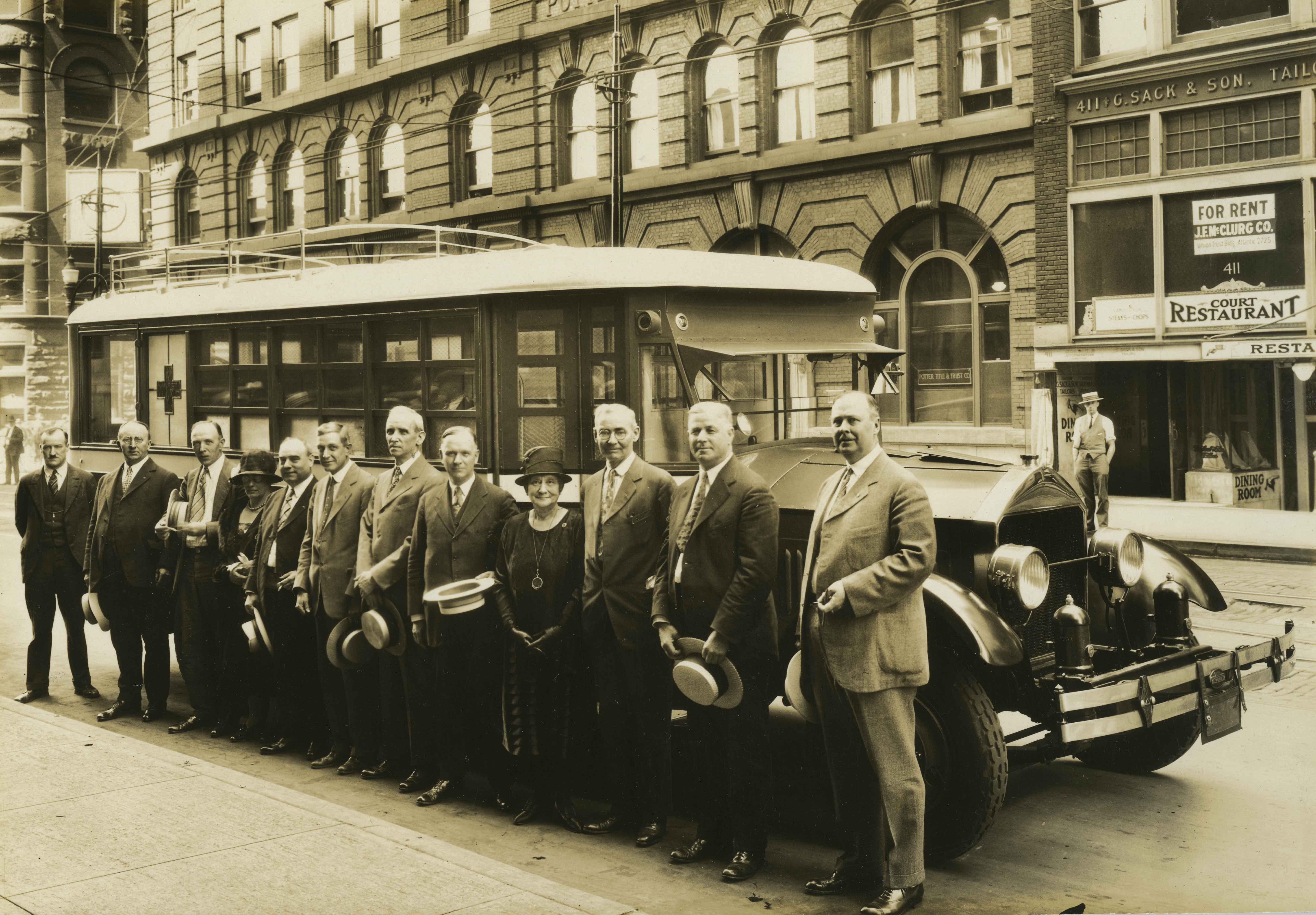 Director of Public Welfare Bertha Rauh with her staff in front of the Mayview Hospital bus.
